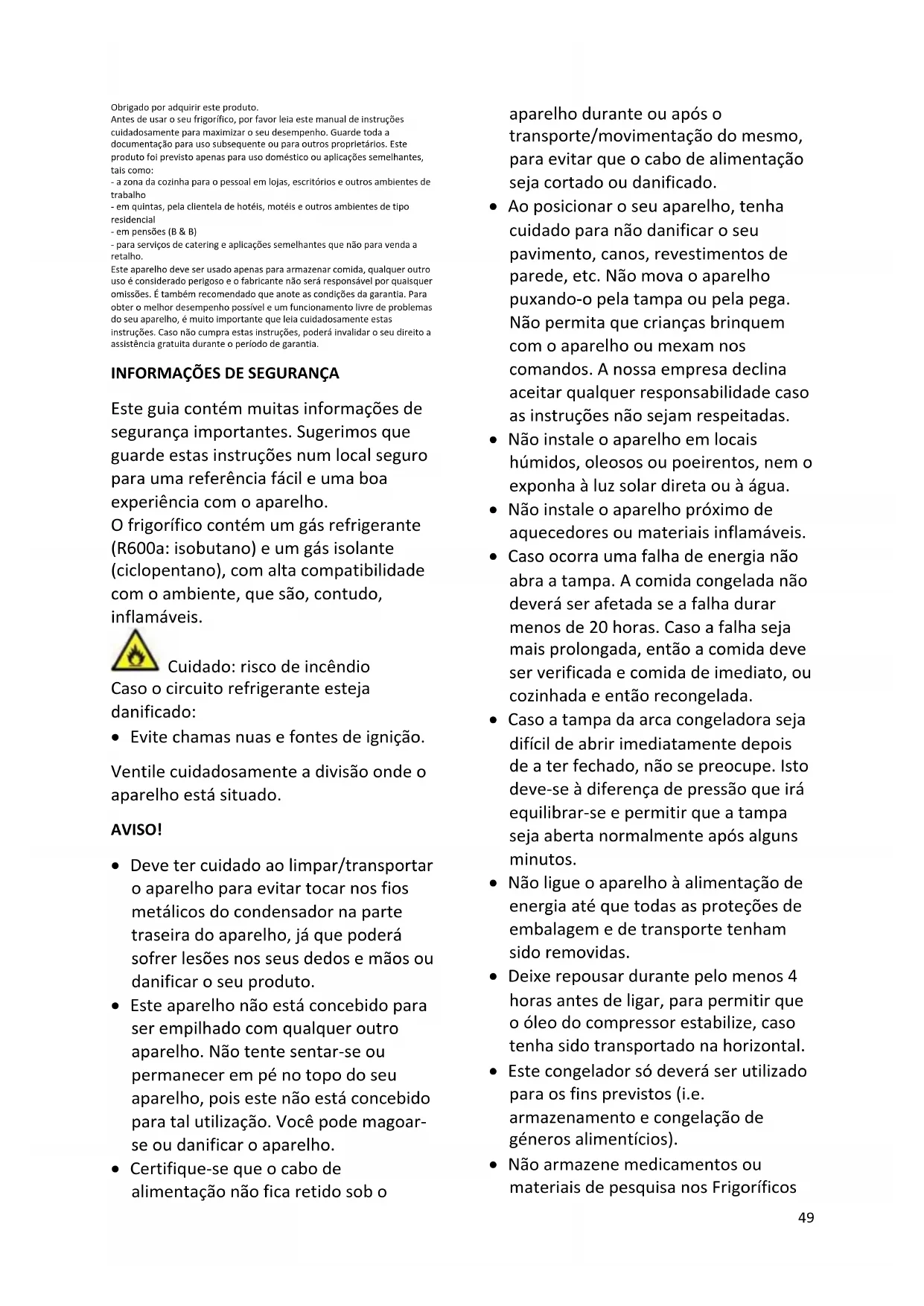 Este guia contém muitas informações de segurança importantes. Sugerimos que guarde estas instruções num local seguro para uma referência fácil e uma boa experiência com o aparelho. O frigorífico contém um gás refrigerante (R600a: isobutano) e um gás isolante (ciclopentano), com alta compatibilidade com o ambiente, que são, contudo, inflamáveis. Cuidado: risco de incêndio Caso o circuito refrigerante esteja danificado: