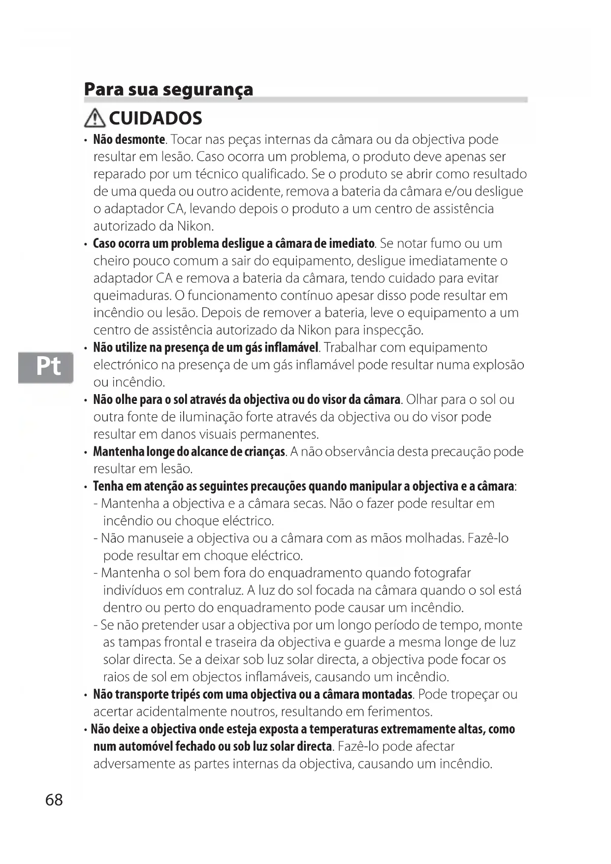 - Não deixe a objectiva onde esteja exposta a temperaturas extremamente altas, como num automóvel fechado ou sob luz solar directa. Fazê-lo pode afectar adversamente as partes internas da objectiva, causando um incêndio.69