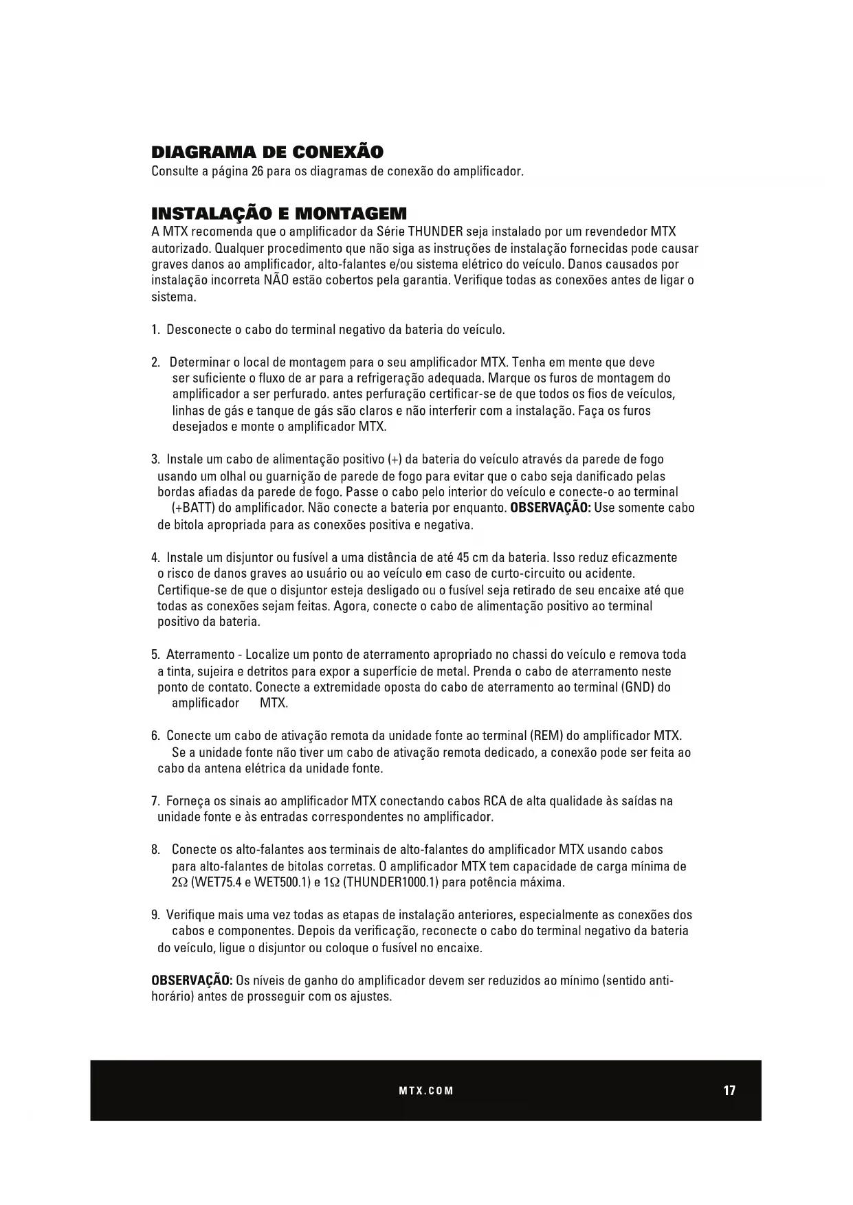 A MTX recomenda que o amplificador da Série THUNDER seja instalado por um revendedor MTX autorizado. Qualquer procedimento que não siga as instruções de instalação fornecidas pode causar graves danos ao amplificador, alto-falantes e/ou sistema elétrico do veículo. Danos causados por instalação incorreta NÃO estão cobertos pela garantia. Verifique todas as conexões antes de ligar o sistema.