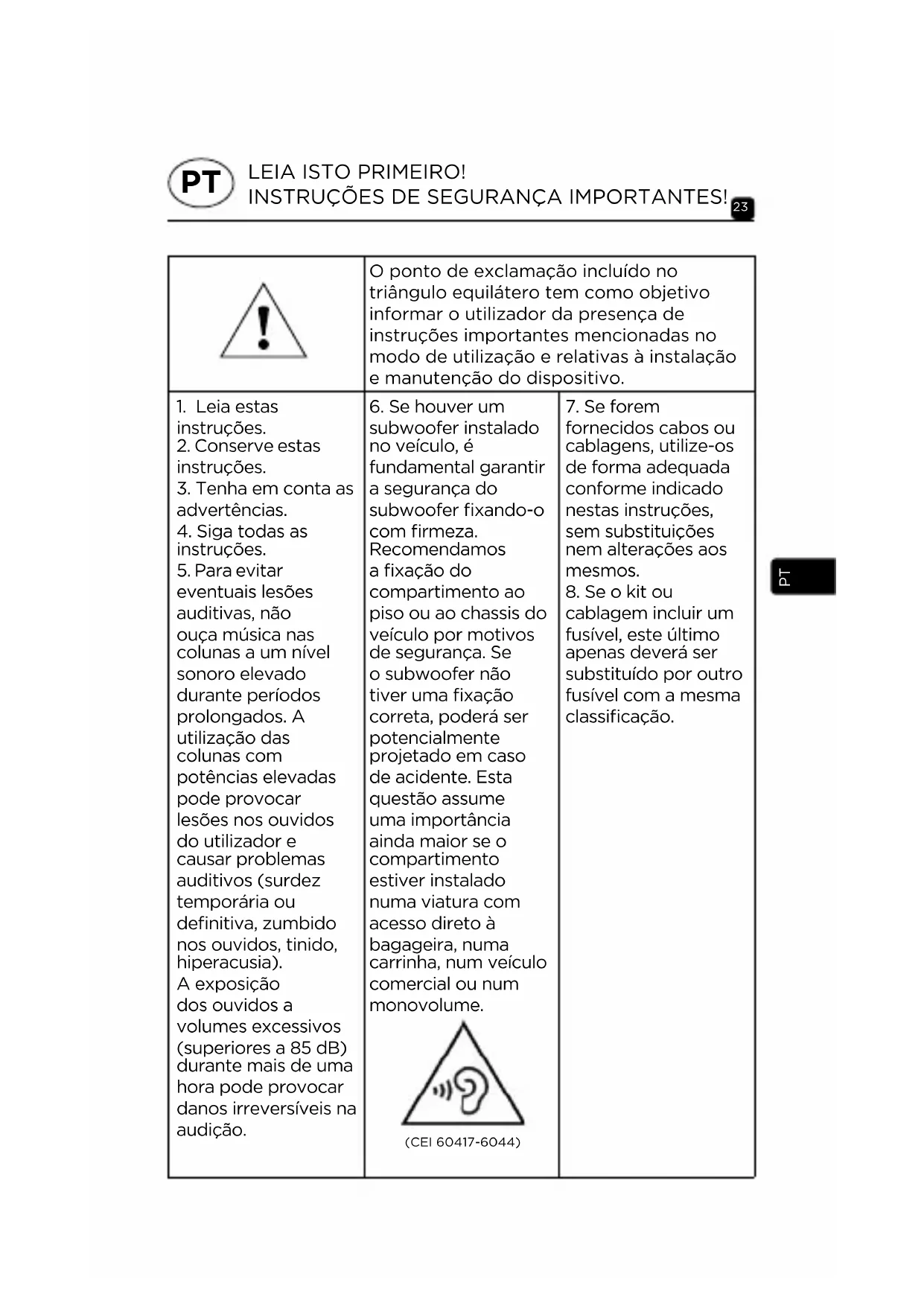 - Faça uma limpeza cuidadosa antes de montar os altifalantes. O desempenho dos subwoofers P 20 FE, P 25 FE, P 20 FSE e P 25 FSE permite atingir níveis sonoros elevados. Lembramos que a audição prolongada de música para além de 85 dB SPL pode prejudicar as suas capacidades auditivas de modo irreversível. Por isso é aconselhável ajustar o nível do seu equipamento em conformidade. Período de rodagem Os altifalantes P 20 FE, P 25 FE, P 20 FSE e P 25 FSE são elementos mecânicos complexos, que requerem um período de adaptação para funcionarem da melhor forma possível e se adaptarem às condições de temperatura e de humidade do seu ambiente. Este período de rodagem varia conforme as condições observadas e pode prolongar-se durante algumas semanas. Para acelerar esta operação, recomendamos que utilize os seus altifalantes durante cerca de vinte horas no nível médio em programas musicais ricos em graves. Logo que as características dos altifalantes estejam totalmente estabilizadas, poderá desfrutar integralmente do desempenho dos seus subwoofers P 20 FE, P 25 FE, P 20 FSE e P 25 FSE. PTLEZEN VOOR GEBRUIK! BELANGRIJKE VEILIGHEIDSINSTRUCTIES! Het uitroepteken in een gelijkzijdige driehoek wordt gebruikt om de gebruiker te laten weten dat er belangrijke instructies volgen in de handleiding over het gebruik en onderhoud van het apparaat.