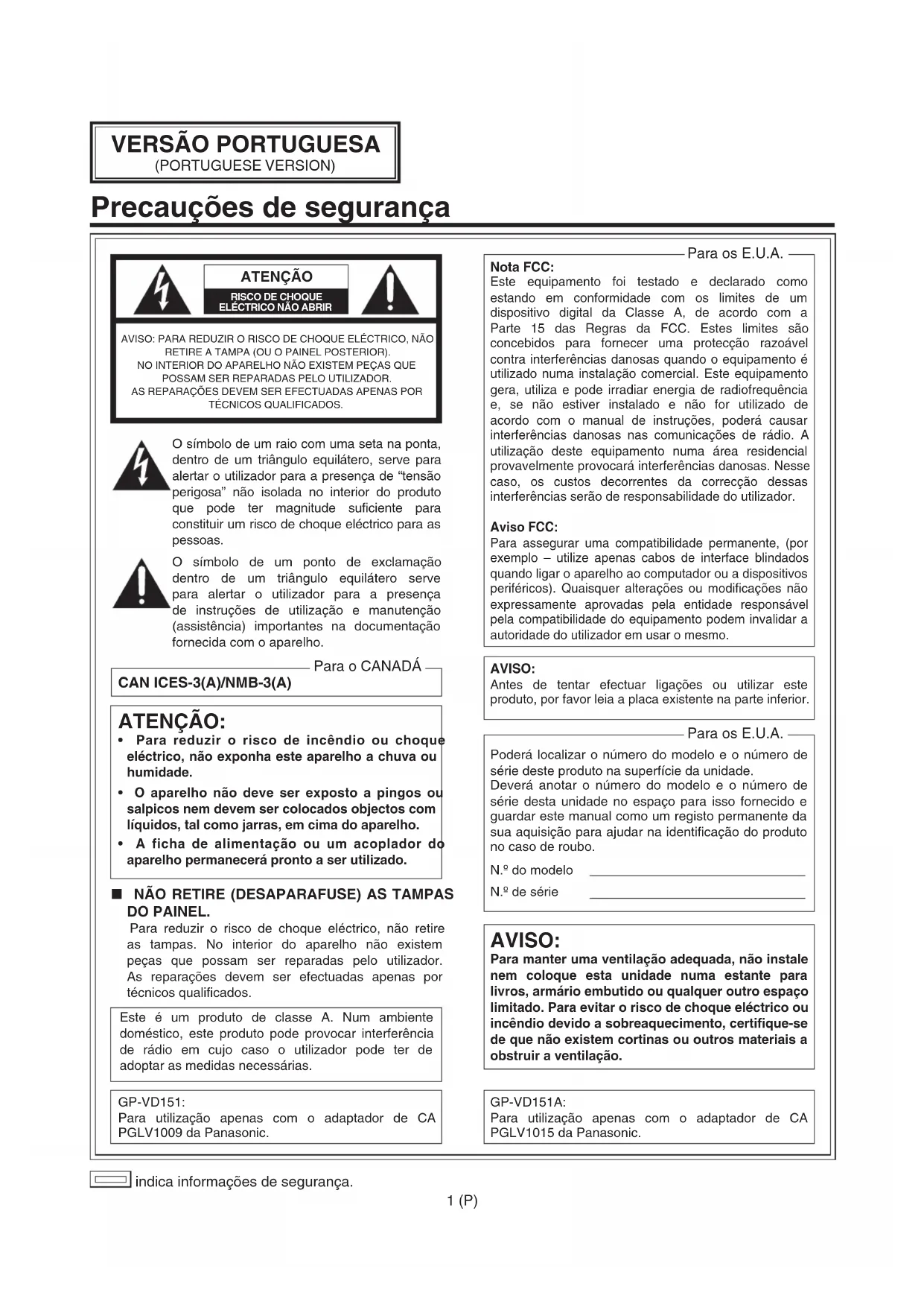 (PORTUGUESE VERSION) Precauções de segurança indica informações de segurança. ATENÇÃO RISCO DE CHOQUE ELÉCTRICO NÃO ABRIRAVISO: PARA REDUZIR O RISCO DE CHOQUE ELÉCTRICO, NÃO RETIRE A TAMPA (OU O PAINEL POSTERIOR).NO INTERIOR DO APARELHO NÃO EXISTEM PEÇAS QUE POSSAM SER REPARADAS PELO UTILIZADOR.AS REPARAÇÕES DEVEM SER EFECTUADAS APENAS POR TÉCNICOS QUALIFICADOS. O símbolo de um raio com uma seta na ponta, dentro de um triângulo equilátero, serve para alertar o utilizador para a presença de “tensão perigosa” não isolada no interior do produto que pode ter magnitude suficiente para constituir um risco de choque eléctrico para as pessoas. O símbolo de um ponto de exclamação dentro de um triângulo equilátero serve para alertar o utilizador para a presença de instruções de utilização e manutenção (assistência) importantes na documentação fornecida com o aparelho. CAN ICES-3(A)/NMB-3(A) Para o CANADÁ Nota FCC: Este equipamento foi testado e declarado como estando em conformidade com os limites de um dispositivo digital da Classe A, de acordo com a Parte 15 das Regras da FCC. Estes limites são concebidos para fornecer uma protecção razoável contra interferências danosas quando o equipamento é utilizado numa instalação comercial. Este equipamento gera, utiliza e pode irradiar energia de radiofrequência e, se não estiver instalado e não for utilizado de acordo com o manual de instruções, poderá causar interferências danosas nas comunicações de rádio. A utilização deste equipamento numa área residencial provavelmente provocará interferências danosas. Nesse caso, os custos decorrentes da correcção dessas interferências serão de responsabilidade do utilizador. Aviso FCC: Para assegurar uma compatibilidade permanente, (por exemplo – utilize apenas cabos de interface blindados quando ligar o aparelho ao computador ou a dispositivos periféricos). Quaisquer alterações ou modificações não expressamente aprovadas pela entidade responsável pela compatibilidade do equipamento podem invalidar a autoridade do utilizador em usar o mesmo. AVISO: Para manter uma ventilação adequada, não instale nem coloque esta unidade numa estante para livros, armário embutido ou qualquer outro espaço limitado. Para evitar o risco de choque eléctrico ou incêndio devido a sobreaquecimento, certifique-se de que não existem cortinas ou outros materiais a obstruir a ventilação. AVISO: Antes de tentar efectuar ligações ou utilizar este produto, por favor leia a placa existente na parte inferior. Poderá localizar o número do modelo e o número de série deste produto na superfície da unidade. Deverá anotar o número do modelo e o número de série desta unidade no espaço para isso fornecido e guardar este manual como um registo permanente da sua aquisição para ajudar na identificação do produto no caso de roubo. N.º do modelo N.º de série Para os E.U.A. GP-VD151A: Para utilização apenas com o adaptador de CA PGLV1015 da Panasonic.