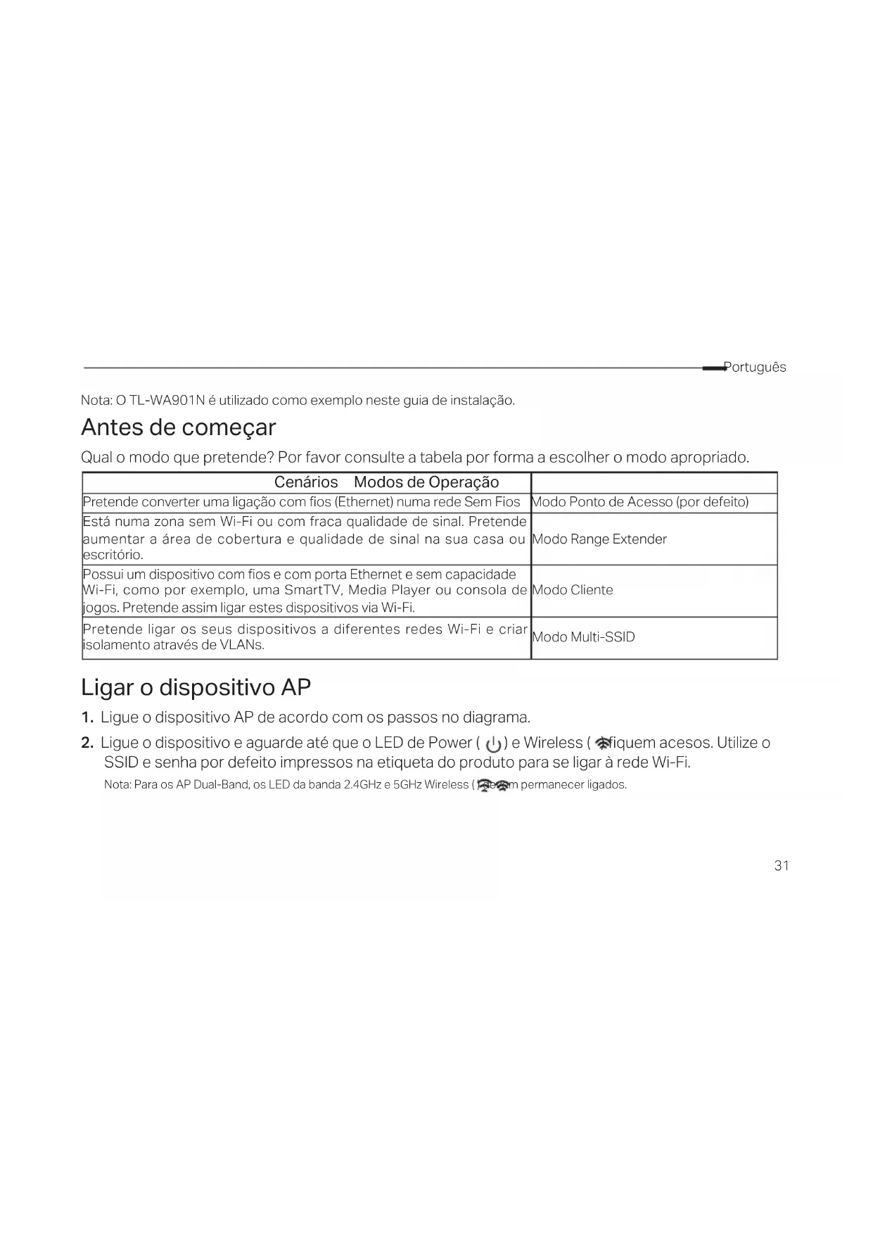 - Spostate l'Access Point in una posizione lontana da dispositivi Bluetooth e altri dispositivi elettronici come telefoni cordless, forni a microonde, baby monitor e altro, al ne di ridurre le interferenze.31 Português Nota: O TL-WA901N é utilizado como exemplo neste guia de instalação. Antes de começar Qual o modo que pretende? Por favor consulte a tabela por forma a escolher o modo apropriado. Cenários Modos de Operação Pretende converter uma ligação com os (Ethernet) numa rede Sem Fios Modo Ponto de Acesso (por defeito) Está numa zona sem Wi-Fi ou com fraca qualidade de sinal. Pretende aumentar a área de cobertura e qualidade de sinal na sua casa ou escritório. Modo Range Extender Possui um dispositivo com os e com porta Ethernet e sem capacidade Wi-Fi, como por exemplo, uma SmartTV, Media Player ou consola de jogos. Pretende assim ligar estes dispositivos via Wi-Fi. Modo Cliente Pretende ligar os seus dispositivos a diferentes redes Wi-Fi e criar isolamento através de VLANs. Modo Multi-SSID Ligar o dispositivo AP