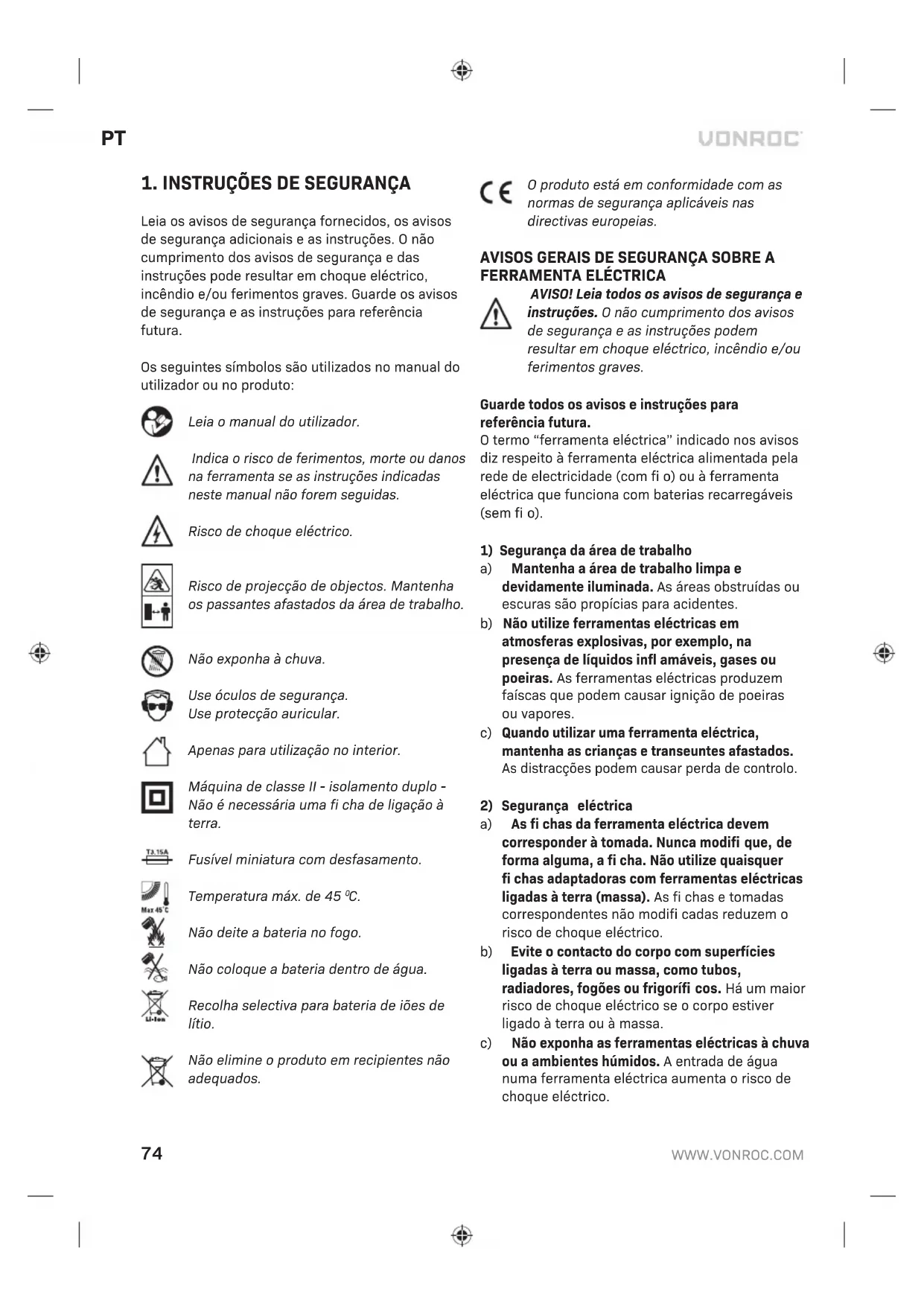 Não abra a bateria. Perigo de curto-circuito. b) Proteja a bateria do calor, por exemplo, contra exposição contínua a luz solar, fogo, água e humidade. Perigo de explosão. c) Em caso de danos e uso inadequado da bateria, podem ser emitidos vapores. Ventile a área e contacte um médico se houver queixas. Os vapores podem irritar o sistema respiratório. d) Utilize a bateria apenas em conjunto com o seu produto da Vonroc. Só isto protege a bateria contra sobrecarga perigosa.