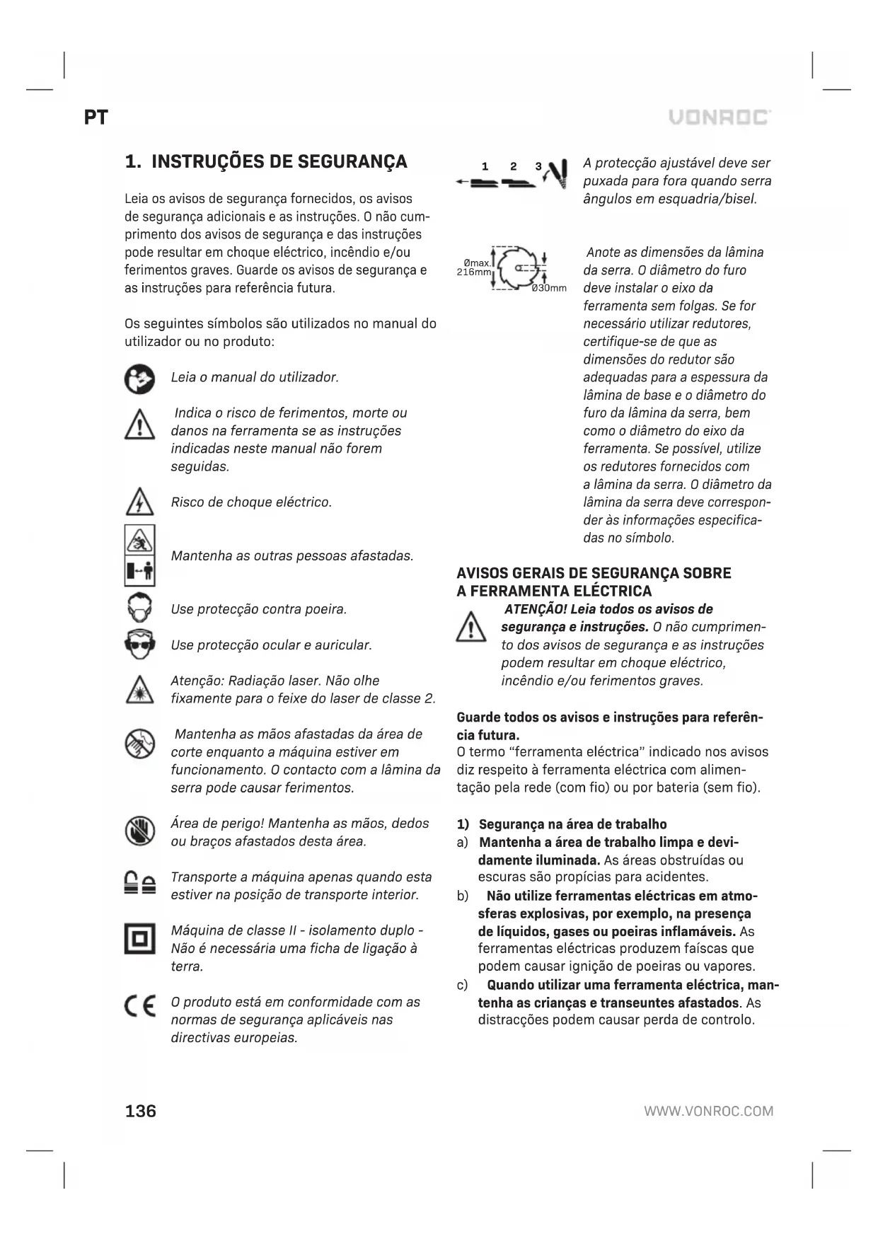 Aperte aporca serrilhada para regular aprofundi- dade (40). Ligar/desligar olaser (Fig. B) Carregue no interruptor do laser (41) para ligar ou desligar olaser. Regulação por incrementos Antes de efectuar qualquer tarefa de ajuste, desligue aficha de alimentação. Para garantir um corte rigoroso, as regulações básicas da serra devem ser verificadas e ajusta- das antes da primeira utilização, bem como as necessárias após utilização intensiva. Para fazê-lo, são necessárias ferramentas especiais adequa- das. Odepartamento pós-vendas da Vonroc ajuda aefectuar este trabalho de maneira rápida e fiável. Regulação do laser por incrementos (Fig. Q) Nota: Para testar ofuncionamento do laser, aferramenta eléctrica deve ser ligada à fonte de alimentação. Quando regular olaser (por exemplo, quando mover obraço da ferramenta), nunca carregue no interruptor para ligar/ desligar. Oarranque acidental da ferramen- ta eléctrica pode causar ferimentos. Se olaser (17) deixar de indicar alinha de corte correcta, pode regular olaser novamente. Para fazê-lo: