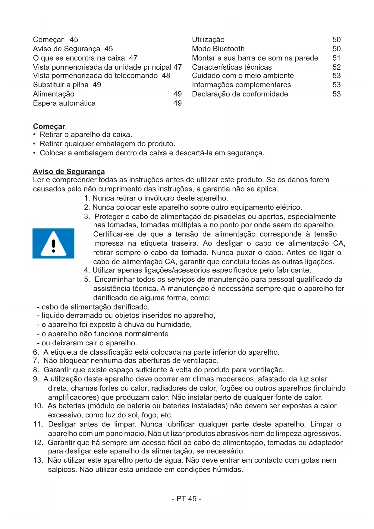salpicos. Não utilizar ea unidade em condições húmidas. Começar 45 Aviso de Segurança 45 O que se encontra na caixa 47 Vista pormenorisada da unidade principal 47 Vista pormenorizada do telecomando 48 Substituir a pilha 49 Alimentação 49 Espera automática 49 Utilização 50 Modo Bluetooth 50 Montar a sua barra de som na parede 51 Características técnicas 52 Cuidado com o meio ambiente 53 Informações complementares 53 Declaração de conformidade 53- PT 46 -