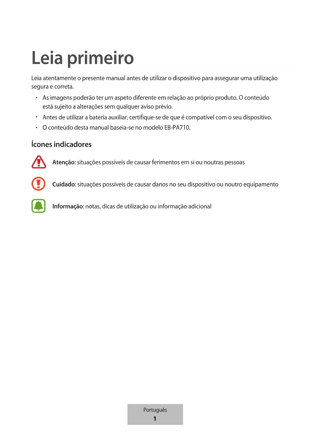 O conteúdo desta manual baseia-se no modelo EB-PA710. Ícones indicadores Atenção: situações possíveis de causar ferimentos em si ou noutras pessoas Cuidado: situações possíveis de causar danos no seu dispositivo ou noutro equipamento Informação: notas, dicas de utilização ou informação adicional Português