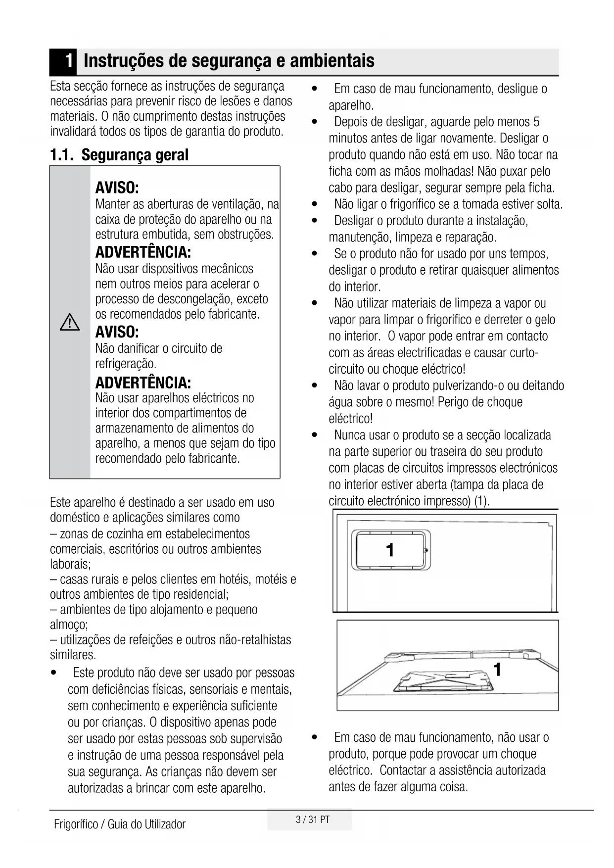 AVISO: Manter as aberturas de ventilação, na caixa de proteção do aparelho ou na estrutura embutida, sem obstruções. ADVERTÊNCIA: Não usar dispositivos mecânicos nem outros meios para acelerar o processo de descongelação, exceto os recomendados pelo fabricante. AVISO: Não danificar o circuito de refrigeração. ADVERTÊNCIA: Não usar aparelhos eléctricos no interior dos compartimentos de armazenamento de alimentos do aparelho, a menos que sejam do tipo recomendado pelo fabricante. Este aparelho é destinado a ser usado em uso doméstico e aplicações similares como – zonas de cozinha em estabelecimentos comerciais, escritórios ou outros ambientes laborais; – casas rurais e pelos clientes em hotéis, motéis e outros ambientes de tipo residencial; – ambientes de tipo alojamento e pequeno almoço; – utilizações de refeições e outros não-retalhistas similares. t Este produto não deve ser usado por pessoas com deficiências físicas, sensoriais e mentais, sem conhecimento e experiência suficiente ou por crianças. O dispositivo apenas pode ser usado por estas pessoas sob supervisão e instrução de uma pessoa responsável pela sua segurança. As crianças não devem ser autorizadas a brincar com este aparelho. t Em caso de mau funcionamento, desligue o aparelho. t Depois de desligar, aguarde pelo menos 5 minutos antes de ligar novamente. Desligar o produto quando não está em uso. Não tocar na ficha com as mãos molhadas! Não puxar pelo cabo para desligar, segurar sempre pela ficha. t Não ligar o frigorífico se a tomada estiver solta. t Desligar o produto durante a instalação, manutenção, limpeza e reparação. t Se o produto não for usado por uns tempos, desligar o produto e retirar quaisquer alimentos do interior. t Não utilizar materiais de limpeza a vapor ou vapor para limpar o frigorífico e derreter o gelo no interior. O vapor pode entrar em contacto com as áreas electrificadas e causar curto- circuito ou choque eléctrico! t Não lavar o produto pulverizando-o ou deitando água sobre o mesmo! Perigo de choque eléctrico! t Nunca usar o produto se a secção localizada na parte superior ou traseira do seu produto com placas de circuitos impressos electrónicos no interior estiver aberta (tampa da placa de circuito electrónico impresso) (1).
