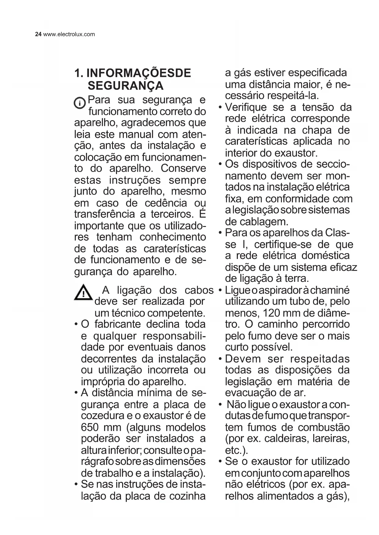 - Se o exaustor for utilizado em conjunto com aparelhos não elétricos (por ex. apa- relhos alimentados a gás), LIVRO DE INSTRUÇÕES PARA UTILIZAÇÃO25PORTUGUESE deve ser tida em devida conta a necessidade de as- segurar um grau suciente de ventilação no aposento, para impedir o retorno dos gases de exaustão. Quan- do o exaustor é utilizado em conjunto com outros aparelhos não alimentados eletricamente, a pressão negativa no aposento não deve ultrapassar 0,04 mbar, para evitar que os fumos re- tornem ao aposento através do exaustor.