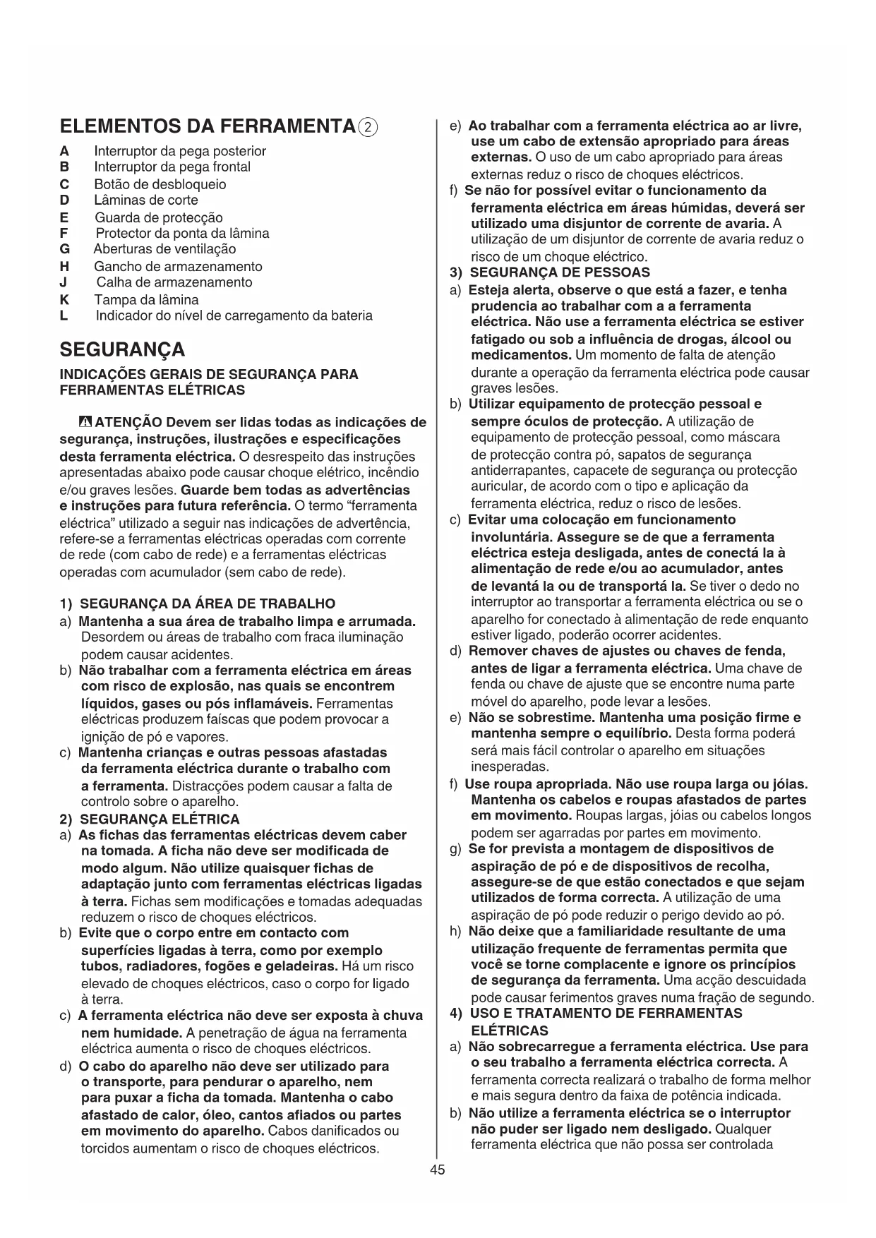 A Interruptor da pega posterior B Interruptor da pega frontal C Botão de desbloqueio D Lâminas de corte E Guarda de protecção F Protector da ponta da lâmina G Aberturas de ventilação H Gancho de armazenamento J Calha de armazenamento K Tampa da lâmina L Indicador do nível de carregamento da bateria SEGURANÇA INDICAÇÕES GERAIS DE SEGURANÇA PARA