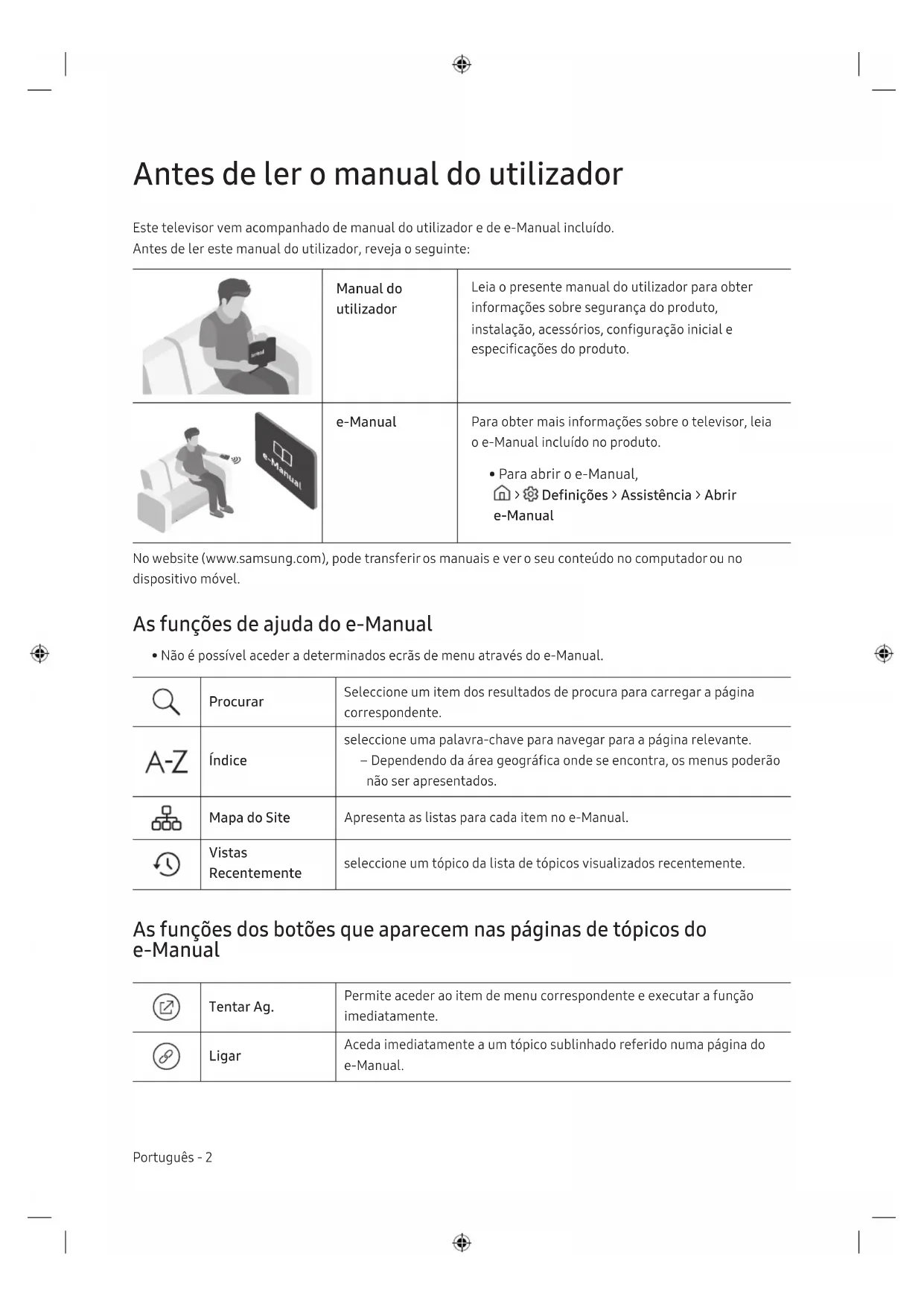 - Para abrir o e-Manual, > Definições > Assistência > Abrir e-Manual No website (www.samsung.com), pode transferir os manuais e ver o seu conteúdo no computador ou no dispositivo móvel. As funções de ajuda do e-Manual
