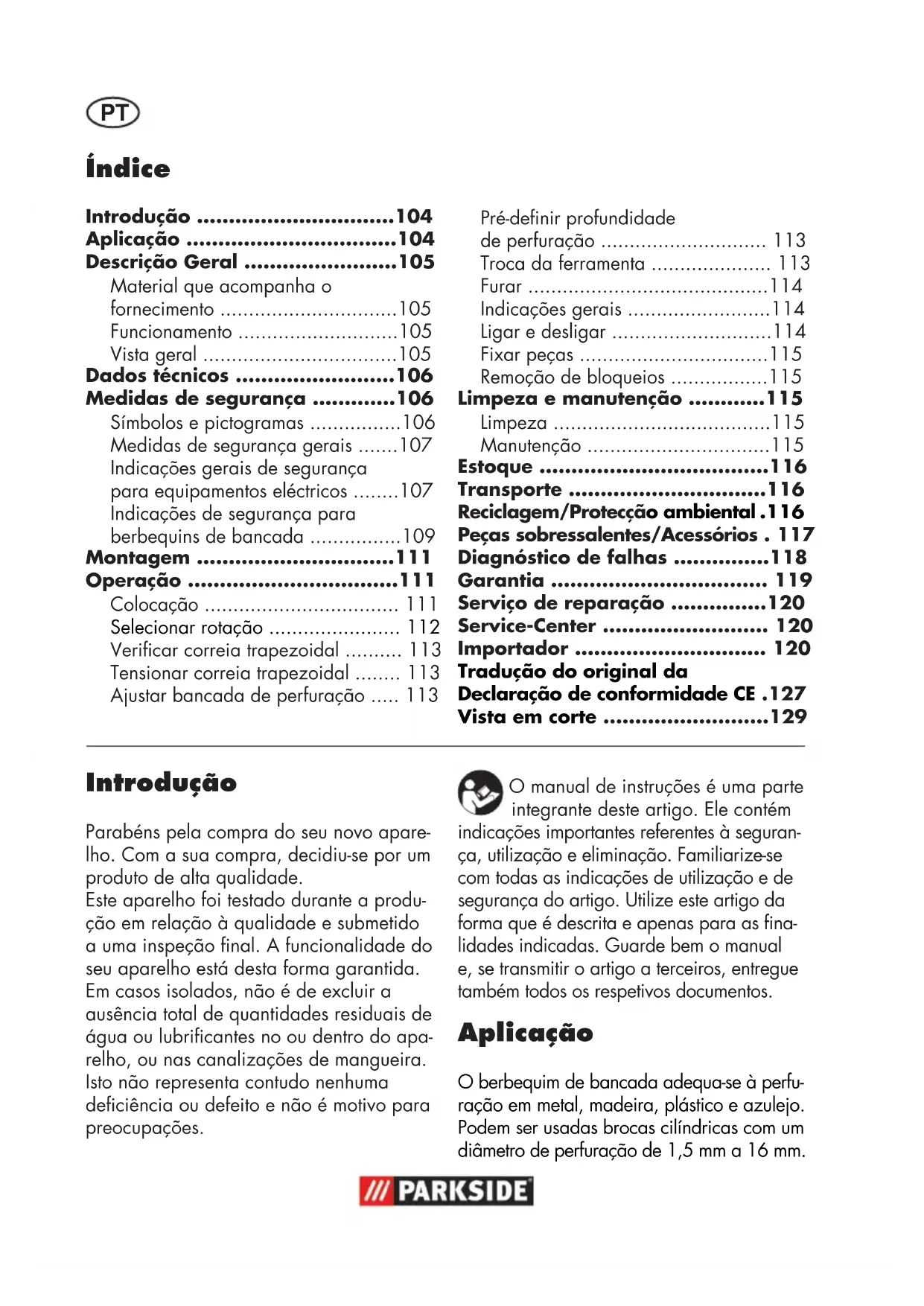 Tensionar correia trapezoidal ........ 113 Ajustar bancada de perfuração ..... 113 Introdução Parabéns pela compra do seu novo apare- lho. Com a sua compra, decidiu-se por um produto de alta qualidade. Este aparelho foi testado durante a produ- ção em relação à qualidade e submetido
