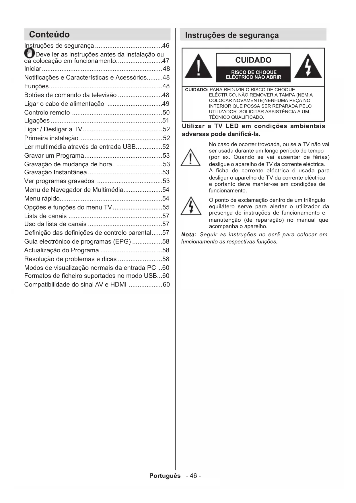 - Compatibilidade do sinal AV e HDMI Instruções de segurança Utilizar a TV LED em condições ambientais adversas pode danicá-la. CUIDADO RISCO DE CHOQUE ELÉCTRICO NÃO ABRIRCUIDADO: PARA REDUZIR O RISCO DE CHOQUE ELÉCTRICO, NÃO REMOVER A TAMPA (NEM A COLOCAR NOVAMENTE)NENHUMA PEÇA NO INTERIOR QUE POSSA SER REPARADA PELO UTILIZADOR. SOLICITAR ASSISTÊNCIA A UM TÉCNICO QUALIFICADO.Nota: Seguir as instruções no ecrã para colocar em funcionamento as respectivas funções.No caso de ocorrer trovoada, ou se a TV não vai ser usada durante um longo período de tempo (por ex. Quando se vai ausentar de férias) desligue o aparelho de TV da corrente eléctrica. A ficha de corrente eléctrica é usada para desligar o aparelho de TV da corrente eléctrica e portanto deve manter-se em condições de funcionamento.O ponto de exclamação dentro de um triângulo equilátero serve para alertar o utilizador da presença de instruções de funcionamento e manutenção (de reparação) no manual que acompanha o aparelho.Português - 47 - dispositivo. Não riscar o ecrã usando as unhas ou outros objectos rijos. p. 60