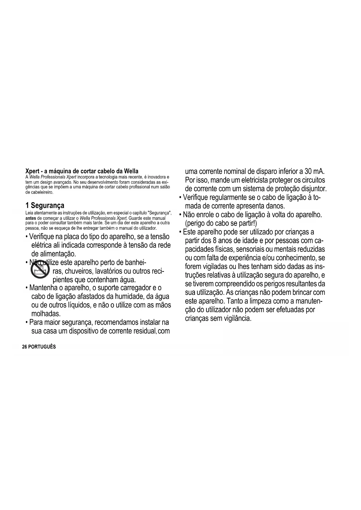 - Este aparelho pode ser utilizado por crianças a partir dos 8 anos de idade e por pessoas com ca- pacidades físicas, sensoriais ou mentais reduzidas ou com falta de experiência e/ou conhecimento, se forem vigiladas ou lhes tenham sido dadas as ins- truções relativas à utilização segura do aparelho, e se tiverem compreendido os perigos resultantes da sua utilização. As crianças não podem brincar com este aparelho. Tanto a limpeza como a manuten- ção do utilizador não podem ser efetuadas por crianças sem vigilância. U24_Wella_Xpert.book Seite 26 Mittwoch, 29. Oktober 2014 4:07 0427PORTUGUÊS