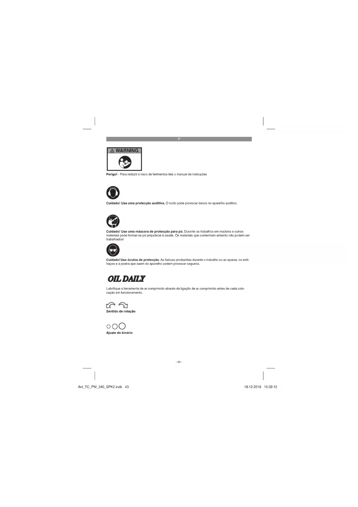 Perigo! - Para reduzir o risco de ferimentos leia o manual de instruções Cuidado! Use uma protecção auditiva. O ruído pode provocar danos no aparelho auditivo. Cuidado! Use óculos de protecção. As faíscas produzidas durante o trabalho ou as aparas, os estil- haços e a poeira que saem do aparelho podem provocar cegueira. Cuidado! Use uma máscara de protecção para pó. Durante os trabalhos em madeira e outros materiais pode formar-se pó prejudicial à saúde. Os materiais que contenham amianto não podem ser trabalhados! Lubrifi que a ferramenta de ar comprimido através da ligação de ar comprimido antes de cada colo- cação em funcionamento. Sentido de rotação Ajuste do binário Anl_TC_PW_340_SPK2.indb 43Anl_TC_PW_340_SPK2.indb 43 18.12.2018 15:39:1218.12.2018 15:39:12P