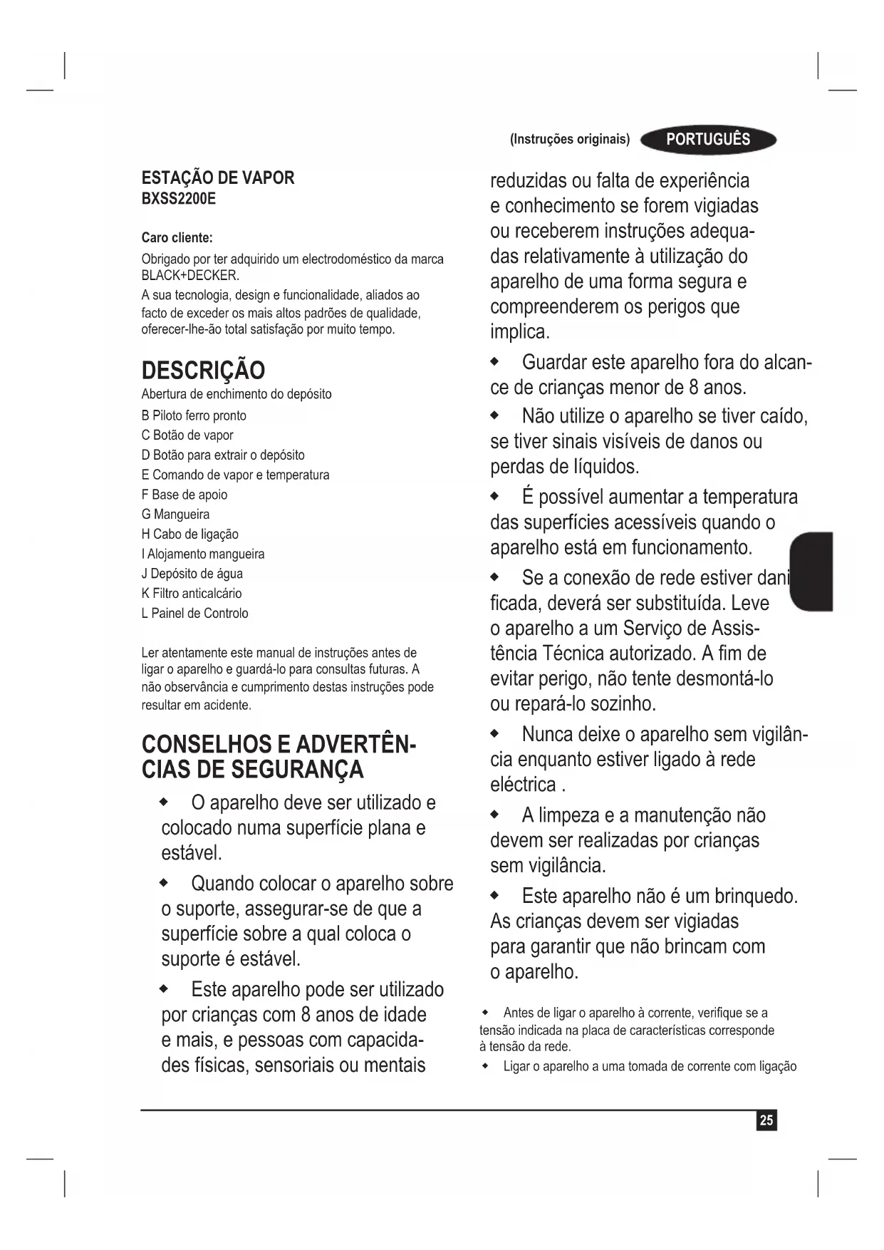 BXSS2200E Caro cliente: Obrigado por ter adquirido um electrodoméstico da marca BLACK+DECKER. A sua tecnologia, design e funcionalidade, aliados ao facto de exceder os mais altos padrões de qualidade, oferecer-lhe-ão total satisfação por muito tempo. DESCRIÇÃO Abertura de enchimento do depósito B Piloto ferro pronto C Botão de vapor D Botão para extrair o depósito E Comando de vapor e temperatura F Base de apoio G Mangueira H Cabo de ligação I Alojamento mangueira J Depósito de água K Filtro anticalcário L Painel de Controlo Ler atentamente este manual de instruções antes de ligar o aparelho e guardá-lo para consultas futuras. A não observância e cumprimento destas instruções pode resultar em acidente.