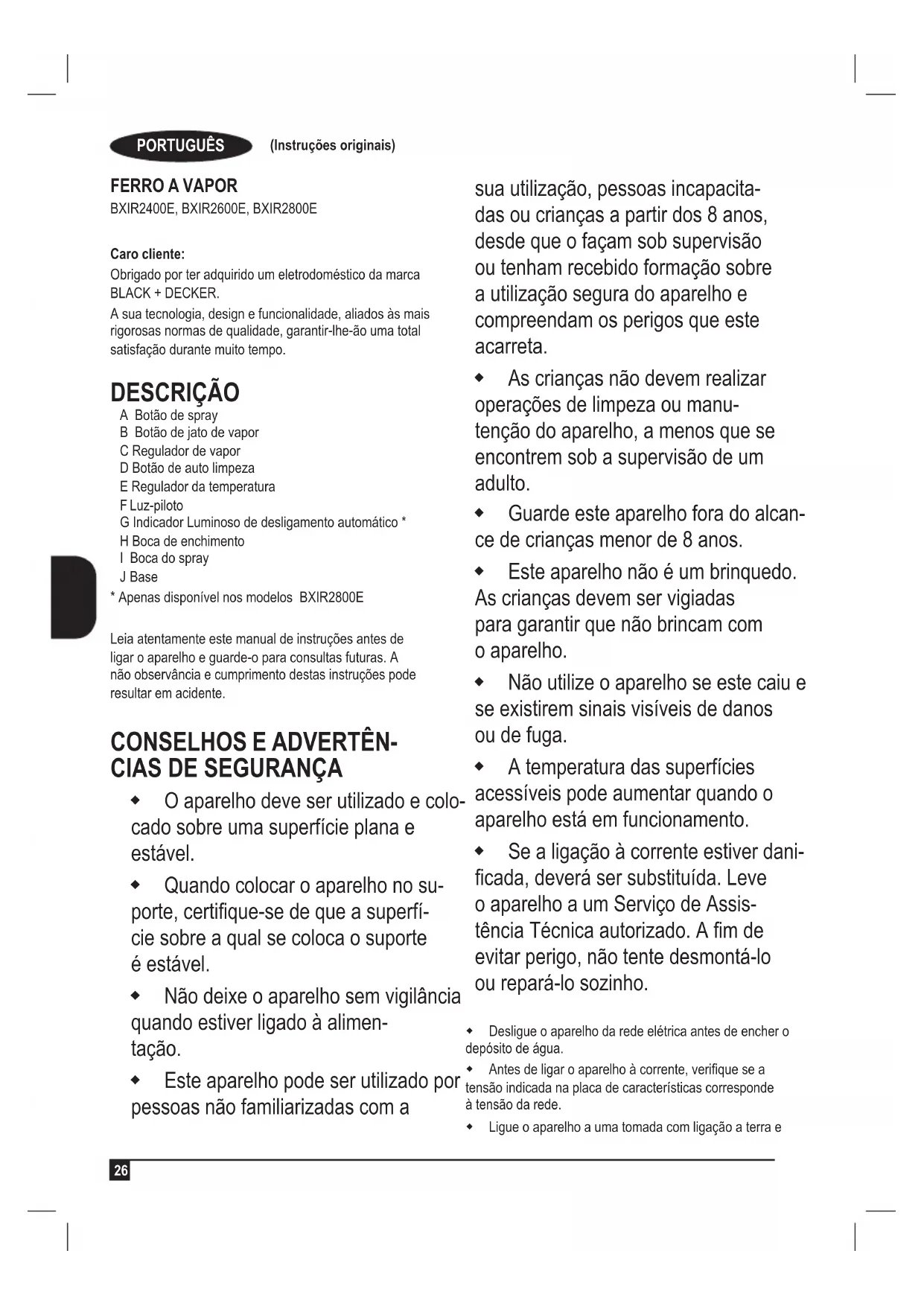 Caro cliente: Obrigado por ter adquirido um eletrodoméstico da marca BLACK + DECKER. A sua tecnologia, design e funcionalidade, aliados às mais rigorosas normas de qualidade, garantir-lhe-ão uma total satisfação durante muito tempo. DESCRIÇÃO A Botão de spray B Botão de jato de vapor C Regulador de vapor D Botão de auto limpeza E Regulador da temperatura F Luz-piloto G Indicador Luminoso de desligamento automático * H Boca de enchimento I Boca do spray J Base