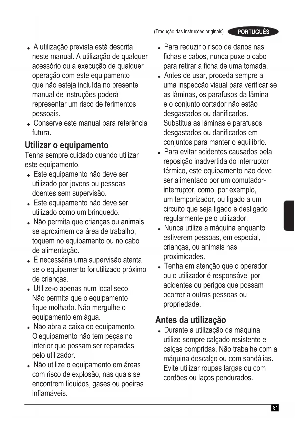 (potencia acústica garantizada) 96 dB(A)Estos productos también cumplen con las directivas 2014/30/UE y 2011/65/UE. Para más información, póngase en contacto con Black & Decker en la siguiente dirección o consulte la parte posterior del manual.El abajo rmante es el responsable de la compilación del archivo técnico y realiza esta declaración en representación de Black & Decker.Becky CotsworthDirector – Grupo de productos para exteriores Black & Decker Europa, 270 Bath Road, Slough, Berkshire, SL1 4DXReino Unido11/10/2019 Garantía Black & Decker confía en la calidad de sus productos y ofrece a los consumidores una garantía de 24 meses a partir de la fecha de compra. Esta garantía75 es adicional a sus derechos legales y no los menoscaba en modo alguno. La garantía es válida dentro de los territorios de los Estados Miembros de la Unión Europea y del Área de Libre Comercio Europea. Para reclamar la garantía, la reclamación se debe presentar de conformidad con las condiciones de Black & Decker. Tendrá que adjuntar un justicante de compra al vendedor o al agente técnico autorizado. Las condiciones de la garantía de 2 años de Black & Decker y la ubicación de su agente de servicio técnico autorizado más cercano se pueden obtener en Internet en www.2helpU.com o poniéndose en contacto con su ocina local de Black & Decker en la dirección que se indica en este manual. Visite nuestro sitio web www.blackanddecker.co.uk para registrar su nuevo producto Black & Decker y recibir noticias sobre nuevos productos y ofertas especiales.81 (Tradução das instruções originais) PORTUGUÊS u A utilização prevista está descrita neste manual. A utilização de qualquer acessório ou a execução de qualquer operação com este equipamento que não esteja incluída no presente manual de instruções poderá representar um risco de ferimentos pessoais. u Conserve este manual para referência futura. Utilizar o equipamento Tenha sempre cuidado quando utilizar este equipamento. u Este equipamento não deve ser utilizado por jovens ou pessoas doentes sem supervisão. u Este equipamento não deve ser utilizado como um brinquedo. u Não permita que crianças ou animais se aproximem da área de trabalho, toquem no equipamento ou no cabo de alimentação. u É necessária uma supervisão atenta se o equipamento for utilizado próximo de crianças. u Utilize-o apenas num local seco. Não permita que o equipamento que molhado. Não mergulhe o equipamento em água. u Não abra a caixa do equipamento. O equipamento não tem peças no interior que possam ser reparadas pelo utilizador. u Não utilize o equipamento em áreas com risco de explosão, nas quais se encontrem líquidos, gases ou poeiras inamáveis. u Para reduzir o risco de danos nas chas e cabos, nunca puxe o cabo para retirar a cha de uma tomada. u Antes de usar, proceda sempre a uma inspecção visual para vericar se as lâminas, os parafusos da lâmina e o conjunto cortador não estão desgastados ou danicados. Substitua as lâminas e parafusos desgastados ou danicados em conjuntos para manter o equilíbrio. u Para evitar acidentes causados pela reposição inadvertida do interruptor térmico, este equipamento não deve ser alimentado por um comutador- interruptor, como, por exemplo, um temporizador, ou ligado a um circuito que seja ligado e desligado regularmente pelo utilizador. u Nunca utilize a máquina enquanto estiverem pessoas, em especial, crianças, ou animais nas proximidades. u Tenha em atenção que o operador ou o utilizador é responsável por acidentes ou perigos que possam ocorrer a outras pessoas ou propriedade. Antes da utilização u Durante a utilização da máquina, utilize sempre calçado resistente e calças compridas. Não trabalhe com a máquina descalço ou com sandálias. Evite utilizar roupas largas ou com cordões ou laços pendurados.82 (Tradução das instruções originais) PORTUGUÊS u Inspeccione rigorosamente a área em que a máquina vai ser utilizada e retire todos os objectos que possam ser projectados pela máquina. u Antes de usar, proceda sempre a uma inspecção visual para vericar se a lâmina, o parafuso da lâmina e o conjunto da lâmina não estão gastos ou danicados. Substitua componentes desgastados ou danicados em conjuntos para manter o equilíbrio. Substitua etiquetas danicadas ou ilegíveis. Após a utilização u Quando não for utilizado, o equipamento deve ser guardado num local seco e com boa ventilação, longe do alcance das crianças. u As crianças não devem ter acesso a equipamentos armazenados. u Se o equipamento for guardado ou transportado num veículo, deve ser colocado na bagageira ou xado para evitar qualquer movimento devido a alterações súbitas na velocidade ou direcção. Inspecção e reparações u Antes da utilização verique se há peças danicadas ou avariadas no equipamento. Verique se há peças partidas, danos nos interruptores ou outro tipo de situações que possam afectar o funcionamento. u Não utilize este equipamento se alguma das peças estiver danicada ou avariada. u Mande reparar ou substituir quaisquer peças danicadas ou avariadas por um agente de reparação autorizado. u Nunca tente retirar ou substituir quaisquer peças que não sejam as especicadas neste manual. u Tenha cuidado quando ajustar o cortador para evitar que os dedos quem presos entre as lâminas/peças em movimento e as peças xas da máquina. u Quando proceder à manutenção das lâminas tenha em atenção que, apesar da fonte de alimentação estar desligada, as lâminas podem deslocar- se. Instruções de segurança adicionais para cortadores de relva u Não transporte a máquina com a fonte de alimentação ligada u Segure bem o manípulo com ambas as mãos quando estiver a manobrar o cortador de relva. u Se, a qualquer altura, for necessário inclinar o cortador de relva, assegure-se de que ambas as mãos permanecem na posição de funcionamento do equipamento enq