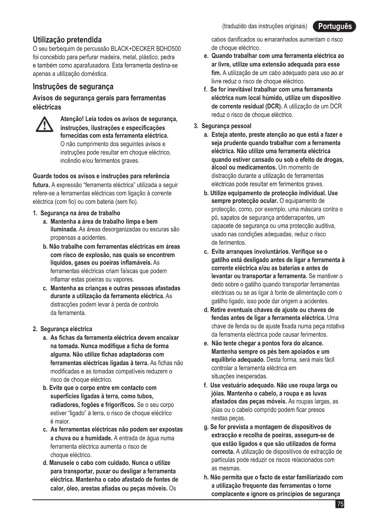 (traduzido das instruções originais) Português (traduzido das instruções originais) Utilização pretendida O seu berbequim de percussão BLACK+DECKER BDHD500 foi concebido para perfurar madeira, metal, plástico, pedra e também como aparafusadora. Esta ferramenta destina-se apenas a utilização doméstica. Instruções de segurança Avisos de segurança gerais para ferramentas eléctricas Atenção! Leia todos os avisos de segurança, instruções, ilustrações e especicações fornecidas com esta ferramenta eléctrica. O não cumprimento dos seguintes avisos e instruções pode resultar em choque eléctrico, incêndio e/ou ferimentos graves. Guarde todos os avisos e instruções para referência futura. A expressão “ferramenta eléctrica” utilizada a seguir refere-se a ferramentas eléctricas com ligação à corrente eléctrica (com o) ou com bateria (sem o).