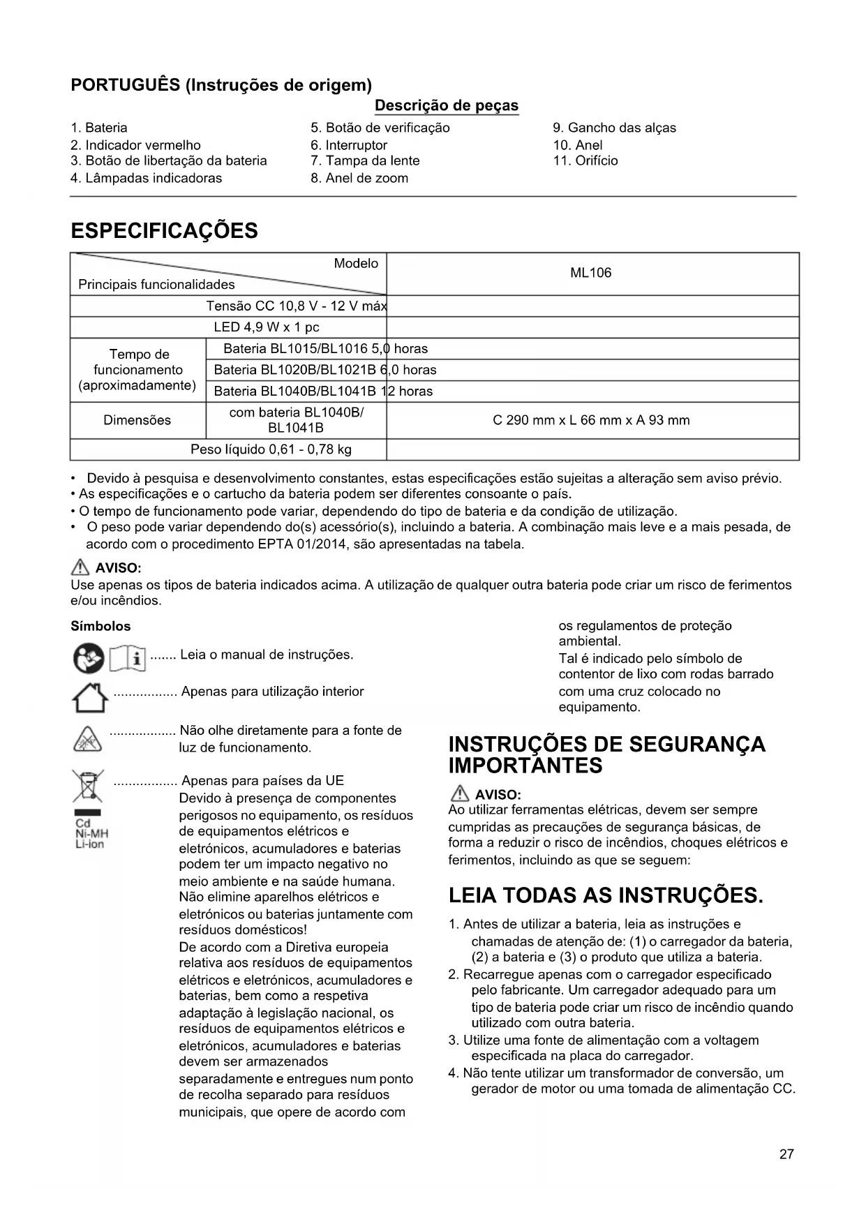 Baixe as instruções para o seu Lanterna em formato PDF gratuitamente! Encontre o seu manual ML106 - MAKITA e retome o controlo do seu dispositivo eletrónico. Nesta página estão publicados todos os documentos necessários para a utilização do seu dispositivo. ML106 da marca MAKITA.