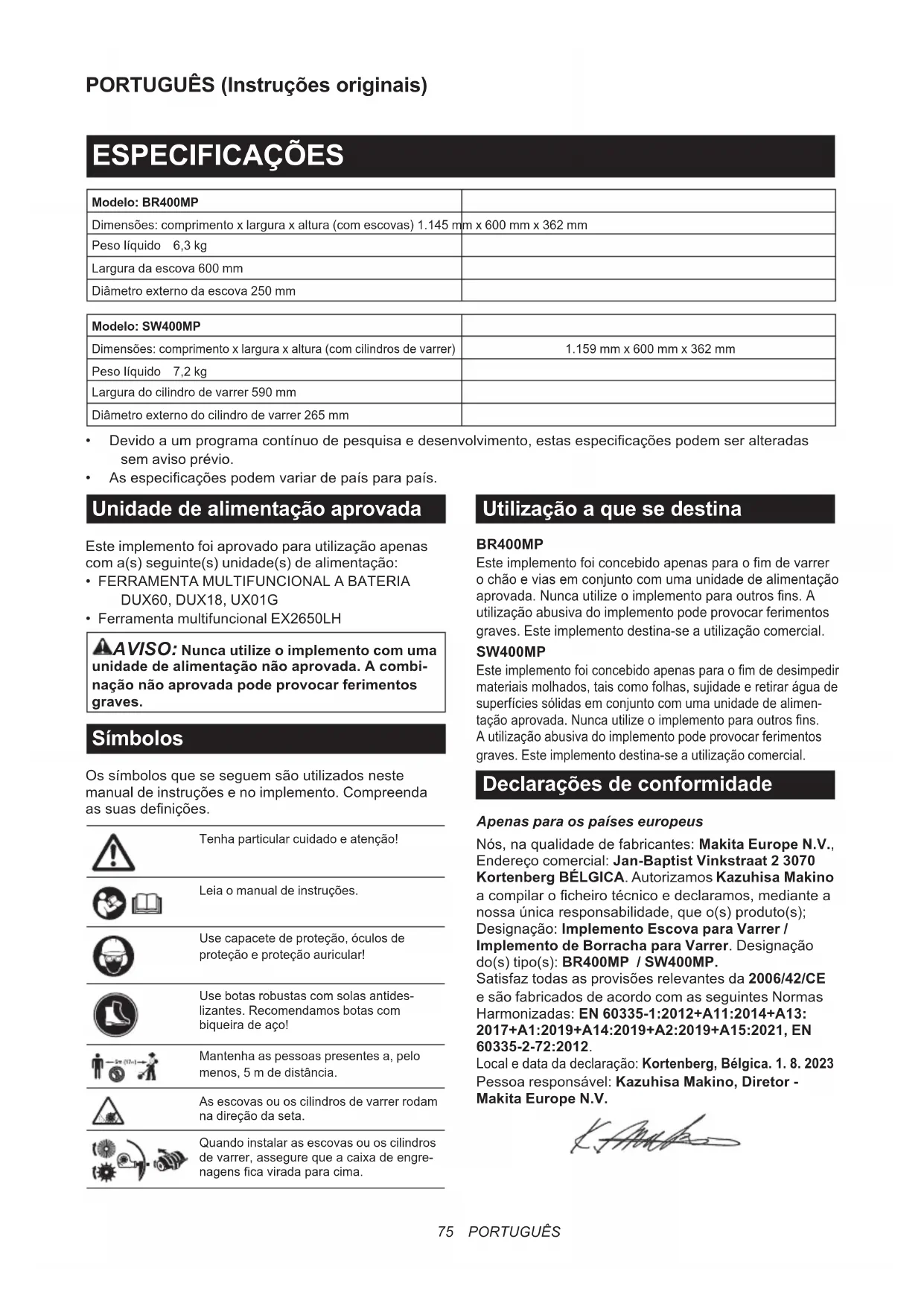 - Ferramenta multifuncional EX2650LH AVISO: Nunca utilize o implemento com uma unidade de alimentação não aprovada. A combi- nação não aprovada pode provocar ferimentos graves. Símbolos Ossímbolosqueseseguemsãoutilizadosneste manual de instruções e no implemento. Compreenda assuasdenições. Tenha particular cuidado e atenção! Leia o manual de instruções. Use capacete de proteção, óculos de proteção e proteção auricular! Use botas robustas com solas antides- lizantes. Recomendamos botas com biqueiradeaço! Mantenha as pessoas presentes a, pelo menos, 5 m de distância. As escovas ou os cilindros de varrer rodam na direção da seta. Quando instalar as escovas ou os cilindros devarrer,assegurequeacaixadeengre- nagenscaviradaparacima. Utilização a que se destina BR400MP Esteimplementofoiconcebidoapenasparaomdevarrer ochãoeviasemconjuntocomumaunidadedealimentação aprovada.Nuncautilizeoimplementoparaoutrosns.A utilização abusiva do implemento pode provocar ferimentos graves. Este implemento destina-se a utilização comercial. SW400MP Esteimplementofoiconcebidoapenasparaomdedesimpedir materiaismolhados,taiscomofolhas,sujidadeeretiraráguade superfíciessólidasemconjuntocomumaunidadedealimen- taçãoaprovada.Nuncautilizeoimplementoparaoutrosns. A utilização abusiva do implemento pode provocar ferimentos graves. Este implemento destina-se a utilização comercial. Declarações de conformidade Apenas para os países europeus Nós,naqualidadedefabricantes:Makita Europe N.V., Endereço comercial: Jan-Baptist Vinkstraat 2 3070 Kortenberg BÉLGICA. Autorizamos Kazuhisa Makino acompilarocheirotécnicoedeclaramos,mediantea nossaúnicaresponsabilidade,queo(s)produto(s); Designação: Implemento Escova para Varrer / Implemento de Borracha para Varrer. Designação do(s) tipo(s): BR400MP / SW400MP. Satisfaz todas as provisões relevantes da 2006/42/CE e são fabricados de acordo com as seguintes Normas Harmonizadas: EN 60335-1:2012+A11:2014+A13: 2017+A1:2019+A14:2019+A2:2019+A15:2021, EN 60335-2-72:2012. Local e data da declaração: Kortenberg, Bélgica. 1. 8. 2023 Pessoa responsável: Kazuhisa Makino, Diretor - Makita Europe N.V. 75PORTUGUÊS