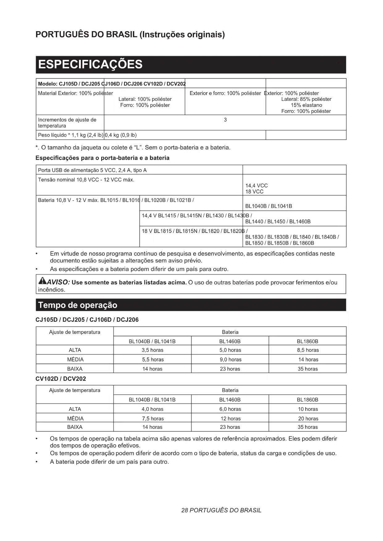- As especicações e a bateria podem diferir de um país para outro. AVISO: Use somente as baterias listadas acima. O uso de outras baterias pode provocar ferimentos e/ou incêndios. Tempo de operação