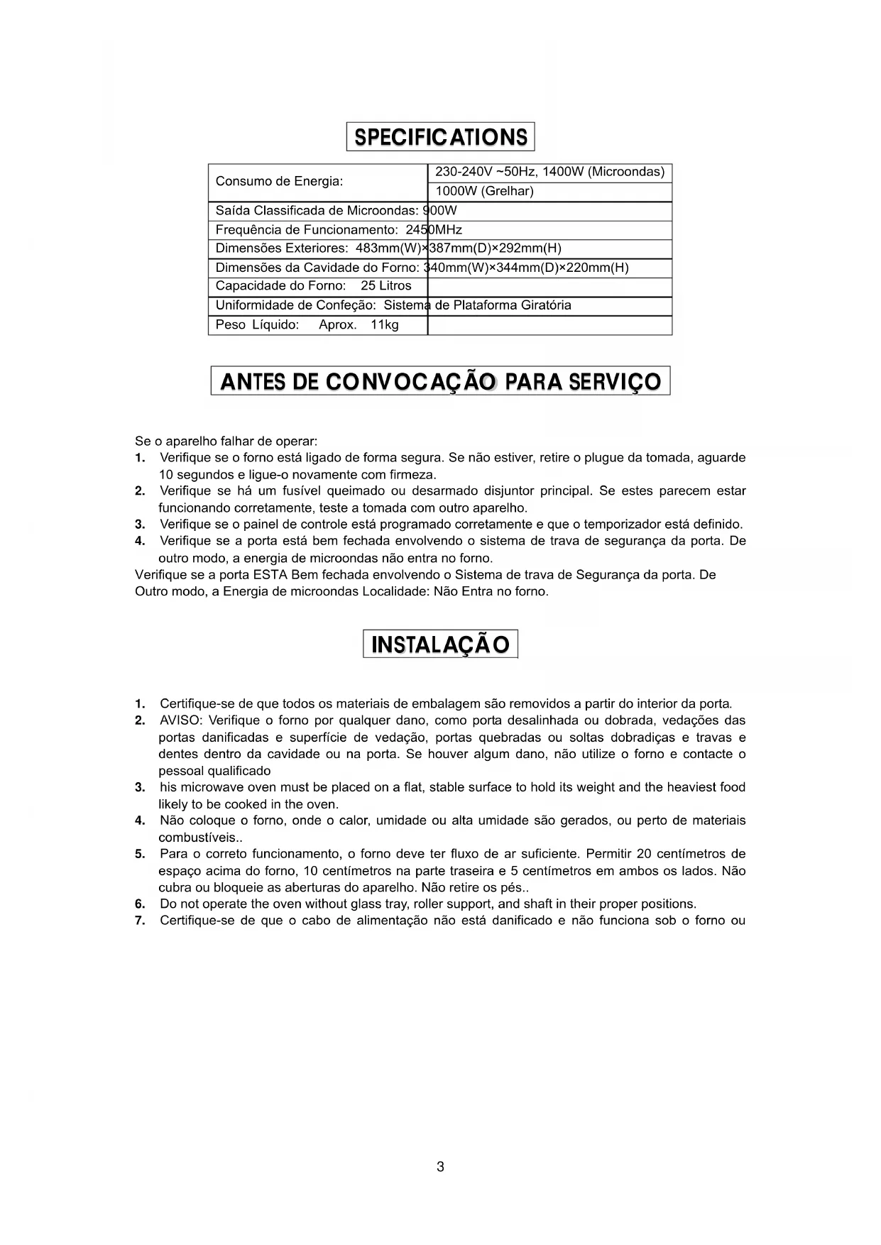 2Consumo de Energia: 230-240V ~50Hz, 1400W (Microondas) 1000W (Grelhar) Saída Classificada de Microondas: 900W Frequência de Funcionamento: 2450MHz Dimensões Exteriores: 483mm(W)×387mm(D)×292mm(H) Dimensões da Cavidade do Forno: 340mm(W)×344mm(D)×220mm(H) Capacidade do Forno: 25 Litros Uniformidade de Confeção: Sistema de Plataforma Giratória Peso Líquido: Aprox. 11kg Se o aparelho falhar de operar: