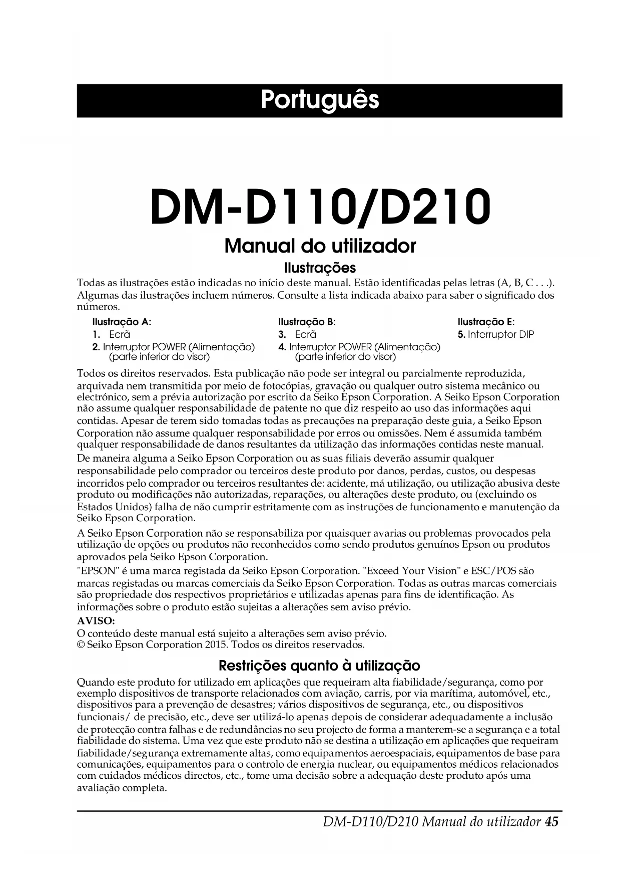 2. Interruptor POWER (Alimentação) (parte inferior do visor)4. Interruptor POWER (Alimentação) (parte inferior do visor)46 DM-D110/D210 Manual do utilizador Precauções de Segurança Esta secção inclui informações importantes cujo objectivo é garantir a utilização eficaz e segura deste produto. Leia esta secção com atenção e guarde-a num local de fácil acesso. AVISO: Se o equipamento emitir fumo, um odor estranho ou um ruído invulgar, desligue-o imediatamente. O uso contínuo pode dar origem a um incêndio. Desligue de imediato a ficha do equipamento e contacte um vendedor ou o Serviço de Assistência Seiko Epson para obter aconselhamento. Nunca tente reparar este produto. Os trabalhos de reparação inadequados podem ser perigosos. Nunca desmonte ou modifique este produto. Alterar este produto pode resultar em danos ou incêndio. Certifique-se de que utiliza a fonte de alimentação especificada. A ligação a uma fonte de alimentação inadequada pode dar origem a um incêndio. Não deixe cair objectos estranhos dentro do equipamento. A penetração efectuada por objectos estranhos pode dar origem a um incêndio. Se derramar água ou outros líquidos neste equipamento, desligue os cabos de imediato e, em seguida, entre em contacto com um vendedor ou o Serviço de Assistência Seiko Epson para obter aconselhamento. CUIDADO: Não ligue os cabos segundo outras instruções a não ser as mencionadas neste manual. Se as ligações forem estabelecidas de maneira diferente, podem ocorrer danos no equipamento e queimaduras. Certifique-se de que coloca o equipamento numa superfície firme, estável e horizontal. O produto pode partir-se ou causar ferimentos se cair. Não utilize o produto em locais sujeitos a humidade ou níveis de poeira elevados. O excesso de humidade e poeira pode causar danos no equipamento ou um incêndio. Não coloque objectos pesados em cima deste produto. Nunca se coloque em cima ou encoste-se neste produto. O equipamento pode cair ou ceder e partir ou provocar ferimentos. Não ligue mais do que um suporte de extensão. Se o dispositivo cair, há o risco de danos ou ferimentos. O ângulo de rotação na horizontal do visor é limitado por um batente. Não aplique força excessiva para rodar o visor para além do limite definido pelo batente. Se o fizer, pode causar danos. Quando instalar e desmontar o cabo, verifique sempre se a alimentação do cliente é desligada e se a unidade é desligada. Tenha cuidado quando utilizar o visor do cliente para não deixá-lo cair nem batê-lo contra qualquer objecto porque tem um tubo de visualização fluorescente integrado. Se não utilizar este produto durante um longo período de tempo, desligue sempre o cabo de alimentação por motivos de segurança. Se mover o produto, certifique-se de que todos os cabos estão desligados antes de movê-lo. Não utilize aspersores aerossóis que contenham gás inflamável no interior ou em torno deste produto. Pois isto pode causar incêndio.DM-D110/D210 Manual do utilizador 47 Descrição geral O DM-D110/DM-D210 é um visor de cliente compacto. Dependendo do ambiente onde é utilizado, pode utilizar um cabo série ou USB. Nomes das peças Consulte as ilustrações A a E. Opções Cada uma das opções é utilizada dependendo da maneira como o produto está instalado. ❏ DP-110: Suporte específico para o DM-D110. Consulte a ilustração A. ❏ DP-210: Suporte específico para o DM-D210. Consulte a ilustração B. ❏ DP-502: Suporte de montagem específico para os modelos DM-D110/DM- D210 (para a impressora TM). Consulte a ilustração C. Download de Controladores, Utilitários e Manuais O donwload das últimas versões de controladores, utilitários e manuais pode ser feito a partir de um dos seguintes URLs. Para clientes na América do Norte, visitar o seguinte sítio Web: http://www.epsonexpert.com/ e seguir as instruções no écran. Para clientes noutros países, visitar o seguinte sítio Web: https://download.epson-biz.com/?service=pos Precauções de ligação Antes de ligar os cabos, certifique-se de que desliga a alimentação de todos os dispositivos ligados a este produto. Quando ligar o transformador AC ao DP-110/DP-210 O DM-D110/DM-D210 começa a funcionar quando o interruptor de alimentação do DM-D110/DM-D210 é ligado. Certifique-se sempre de que liga primeiro o interruptor de alimentação do DM- D110/DM-D210 e, em seguida, os dispositivos ligados a estes modelos. Nota: Quando o modelo USB da impressora TM é ligado, o sistema pode não conseguir detectar o DM-D110/DM-D210 se a alimentação para o DM-D110/DM-D210 for ligada demasiado tarde. Quando ligar a fonte de alimentação do USB bus* ao DM-D110 O DM-D110 funciona de acordo com o estado de ligado/ligado no lado do anfitrião, independentemente do estado do interruptor de alimentação do DM- D110.