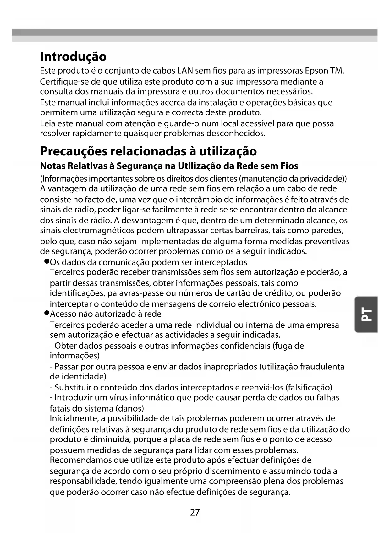 Port uguê s Introdução Este produto é o conjunto de cabos LAN sem fios para as impressoras Epson TM. Certifique-se de que utiliza este produto com a sua impressora mediante a consulta dos manuais da impressora e outros documentos necessários. Este manual inclui informações acerca da instalação e operações básicas que permitem uma utilização segura e correcta deste produto. Leia este manual com atenção e guarde-o num local acessível para que possa resolver rapidamente quaisquer problemas desconhecidos. Precauções relacionadas à utilização Notas Relativas à Segurança na Utilização da Rede sem Fios (Informações importantes sobre os direitos dos clientes (manutenção da privacidade)) A vantagem da utilização de uma rede sem fios em relação a um cabo de rede consiste no facto de, uma vez que o intercâmbio de informações é feito através de sinais de rádio, poder ligar-se facilmente à rede se se encontrar dentro do alcance dos sinais de rádio. A desvantagem é que, dentro de um determinado alcance, os sinais electromagnéticos podem ultrapassar certas barreiras, tais como paredes, pelo que, caso não sejam implementadas de alguma forma medidas preventivas de segurança, poderão ocorrer problemas como os a seguir indicados.