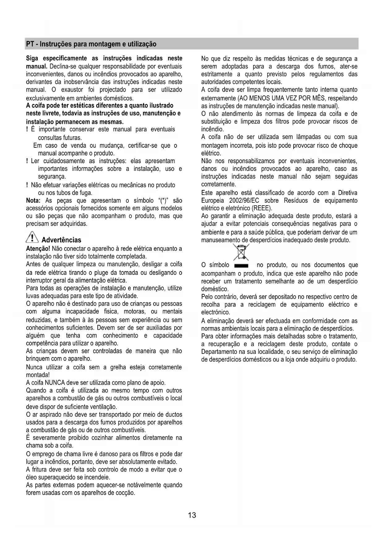 Si la iluminación no funciona, antes de llamar al servicio de asistencia técnica, controlar que las lámparas estén bien montadas en su sede.13 PT - Instruções para montagem e utilização Siga especificamente as instruções indicadas neste manual. Declina-se qualquer responsabilidade por eventuais inconvenientes, danos ou incêndios provocados ao aparelho, derivantes da inobservância das instruções indicadas neste manual. O exaustor foi projectado para ser utilizado exclusivamente em ambientes domésticos. A coifa pode ter estéticas diferentes a quanto ilustrado neste livrete, todavia as instruções de uso, manutenção e instalação permanecem as mesmas. ! É importante conservar este manual para eventuais consultas futuras. Em caso de venda ou mudança, certificar-se que o manual acompanhe o produto. ! Ler cuidadosamente as instruções: elas apresentam importantes informações sobre a instalação, uso e segurança. ! Não efetuar variações elétricas ou mecânicas no produto ou nos tubos de fuga. Nota: As peças que apresentam o símbolo “(*)” são acessórios opcionais fornecidos somente em alguns modelos ou são peças que não acompanham o produto, mas que precisam ser adquiridas. Advertências Atenção! Não conectar o aparelho à rede elétrica enquanto a instalação não tiver sido totalmente completada. Antes de qualquer limpeza ou manutenção, desligar a coifa da rede elétrica tirando o pluge da tomada ou desligando o interruptor geral da alimentação elétrica. Para todas as operações de instalação e manutenção, utilize luvas adequadas para este tipo de atividade. O aparelho não é destinado para uso de crianças ou pessoas com alguma incapacidade fisica, motoras, ou mentais reduzidas, e também à às pessoas sem experiência ou sem conhecimentos suficientes. Devem ser de ser auxiliadas por alguém que tenha com conhecimento e capacidade competência para utilizar o aparelho. As crianças devem ser controladas de maneira que não brinquem com o aparelho. Nunca utilizar a coifa sem a grelha esteja corretamente montada! A coifa NUNCA deve ser utilizada como plano de apoio. Quando a coifa é utilizada ao mesmo tempo com outros aparelhos a combustão de gás ou outros combustíveis o local deve dispor de suficiente ventilação. O ar aspirado não deve ser transportado por meio de ductos usados para a descarga dos fumos produzidos por aparelhos a combustão de gás ou de outros combustíveis. É severamente proibido cozinhar alimentos diretamente na chama sob a coifa. O emprego de chama livre é danoso para os filtros e pode dar lugar a incêndios, portanto, deve ser absolutamente evitado. A fritura deve ser feita sob controlo de modo a evitar que o óleo superaquecido se incendeie. As partes externas podem aquecer-se notávelmente quando forem usadas com os aparelhos de cocção. No que diz respeito às medidas técnicas e de segurança a serem adoptadas para a descarga dos fumos, ater-se estritamente a quanto previsto pelos regulamentos das autoridades competentes locais. A coifa deve ser limpa frequentemente tanto interna quanto externamente (AO MENOS UMA VEZ POR MÊS, respeitando as instruções de manutenção indicadas neste manual). O não atendimento às normas de limpeza da coifa e de substituição e limpeza dos filtros pode provocar riscos de incêndio. A coifa não de ser utilizada sem lâmpadas ou com sua montagem incorreta, pois isto pode provocar risco de choque elétrico. Não nos responsabilizamos por eventuais inconvenientes, danos ou incêndios provocados ao aparelho, caso as instruções indicadas neste manual não sejam seguidas corretamente. Este aparelho está classificado de acordo com a Diretiva Europeia 2002/96/EC sobre Resíduos de equipamento elétrico e eletrónico (REEE). Ao garantir a eliminação adequada deste produto, estará a ajudar a evitar potenciais consequências negativas para o ambiente e para a saúde pública, que poderiam derivar de um manuseamento de desperdícios inadequado deste produto. O símbolo no produto, ou nos documentos que acompanham o produto, indica que este aparelho não pode receber um tratamento semelhante ao de um desperdício doméstico. Pelo contrário, deverá ser depositado no respectivo centro de recolha para a reciclagem de equipamento eléctrico e electrónico. A eliminação deverá ser efectuada em conformidade com as normas ambientais locais para a eliminação de desperdícios. Para obter informações mais detalhadas sobre o tratamento, a recuperação e a reciclagem deste produto, contate o Departamento na sua localidade, o seu serviço de eliminação de desperdícios domésticos ou a loja onde adquiriu o produto.14 Uso A coifa é fabricada para ser utilizada na versão aspirante, com exaustão externa do ar, ou filtrante, com recirculação interna. Versão aspirante Os vapores são evacuados para o exterior por meio de um tubo de descarga fixado á flange de conexão que se encontra sobre o exaustor. O diâmetro do tubo de descarga deve ser equivalente ao diâmetro do anel de conexão. Na parte horizontal o tubo deve ter uma leve inclinação para cima (cerca de 10°) de modo a poder transportar o ar para fora mais facilmente. Se o exaustor for dotada de filtros de carvão ativo, estes deverão ser tirados. Conectar a coifa ao tubos e orifícios de descarga de parede com diâmetro equivalente à saída de ar (flange de união). O uso de tubos ou orifícios de descarga de parede com diâmetro inferior pode provocar a diminuição da performance de aspiração e um drástico aumento do ruído. Não nos responsabilizamos a este respeito. ! Utilizar um tubo condutor com o comprimento não inferior ao indicado. ! Utilizar um tubo condutor com o menor número possível de curvas (ângulo máximo da curva: 90ºC 90°). ! Evitar alterações drásticas da seção do tubo (diâmetro). ! Usar um tubo condutor com o interior mais liso possível. ! O material do tubo condutor deve