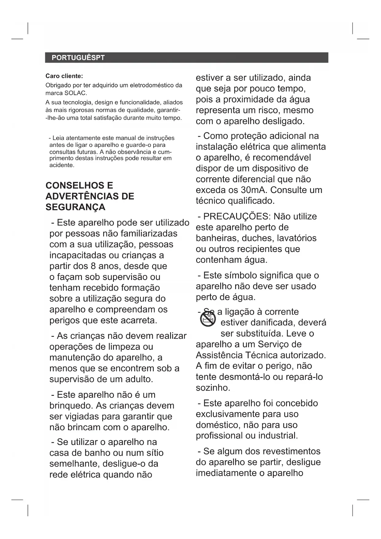 - Em caso de avaria leve o aparelho a um Servico de Assistencia Técnica autorizzato. Não tente descentmorar ou reparar o aparelho, não que tal acarreta perigos.