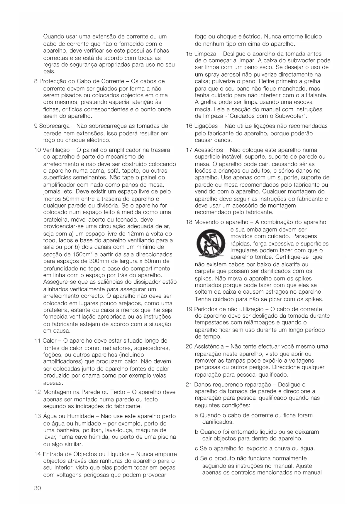 elo fabricante do aparelho, porque poderão causar danos. 17 Acessórios – Não coloque este aparelho numa superfície instável, suporte, suporte de parede ou mesa. O aparelho pode cair, causando sérias lesões a crianças ou adultos, e sérios danos no aparelho. Use apenas com um suporte, suporte de parede ou mesa recomendados pelo fabricante ou vendido com o aparelho. Qualquer montagem do aparelho deve seguir as instruções do fabricante e deve usar um acessório de montagem recomendado pelo fabricante. 18 Movendo o aparelho – A combinação do aparelho e sua embalagem devem ser movidos com cuidado. Paragens rápidas, força excessiva e superfícies irregulares podem fazer com que o aparelho tombe. Certifique-se que não existem cabos por baixo da alcatifa ou carpete que possam ser danificados com os spikes. Não mova o aparelho com os spikes montados porque pode fazer com que eles se soltem da caixa e causem estragos no aparelho. Tenha cuidado para não se picar com os spikes. 19 Períodos de não utilização – O cabo de corrente do aparelho deve ser desligado da tomada durante tempestades com relâmpagos e quando o aparelho ficar sem uso durante um longo período de tempo. 20 Assistência – Não tente efectuar você mesmo uma reparação neste aparelho, visto que abrir ou remover as tampas pode expô-lo a voltagens perigosas ou outros perigos. Direccione qualquer reparação para pessoal qualificado. 21 Danos requerendo reparação – Desligue o aparelho da tomada de parede e direccione a reparação para pessoal qualificado quando nas seguintes condições: a Quando o cabo de corrente ou ficha foram danificados. b Quando foi entornado líquido ou se deixaram cair objectos para dentr o do apar elho. c Se o aparelho foi exposto a chuva ou água. d Se o produto não funciona normalmente seguindo as instruções no manual. Ajuste apenas os contr olos mencionados no manual