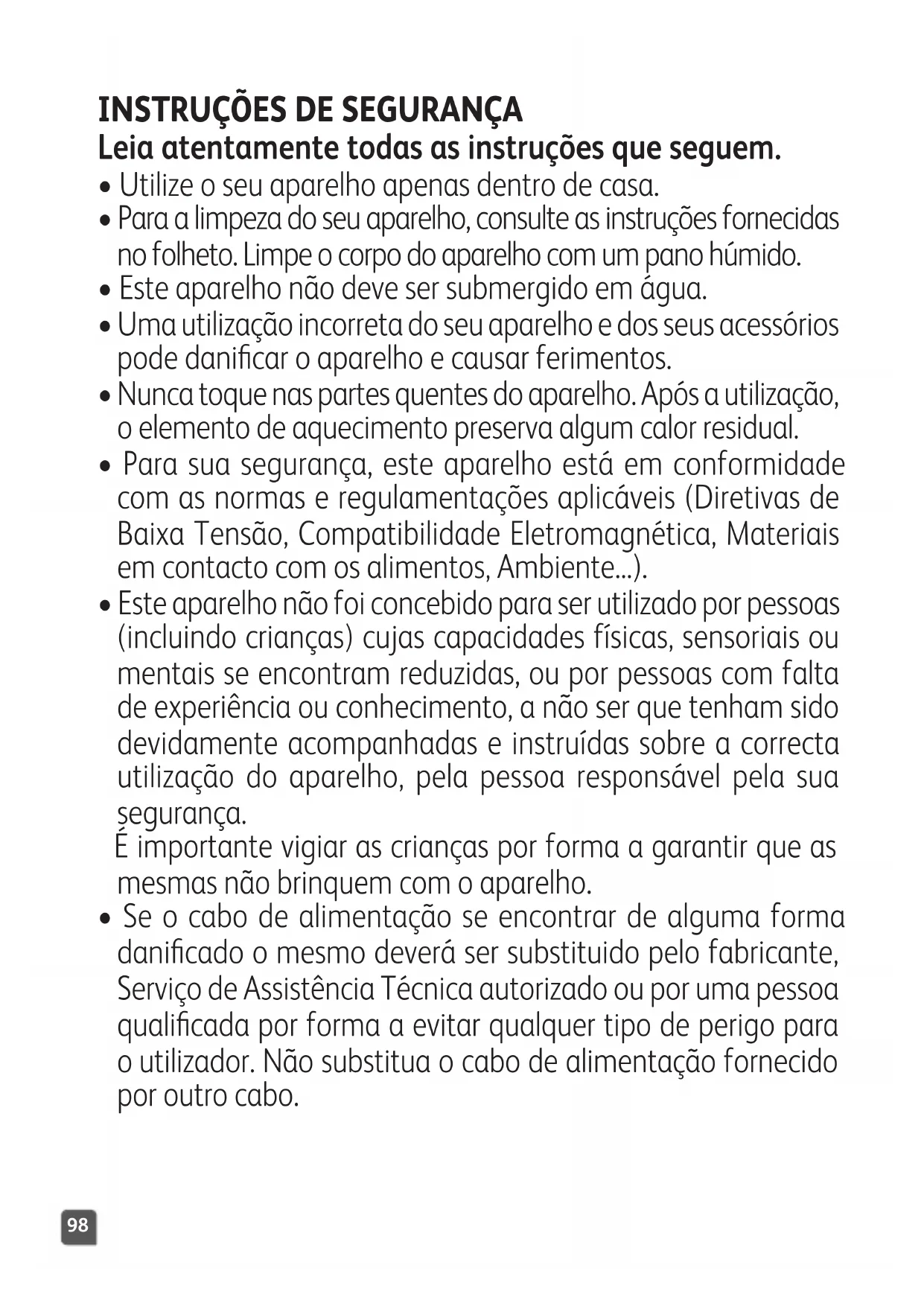 - Não utilize um aparelho danificado; envie-o para o Serviço de Assistência Técnica autorizado. GUARDE ESTAS INSTRUÇÕES PARA FUTURAS UTILIZAÇÕES.