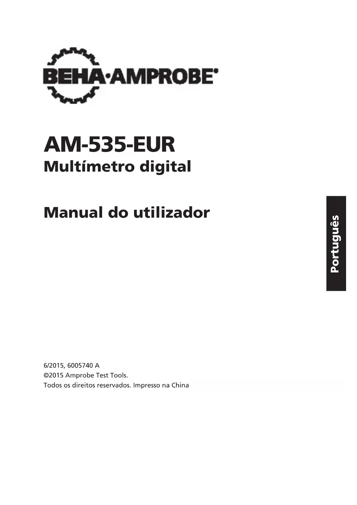 Multímetro digital Manual do utilizador 6/2015, 6005740 A ©2015 Amprobe Test Tools. Todos os direitos reservados. Impresso na China PortuguêsGarantia Limitada e Limitação de Responsabilidade O seu produto Amprobe tem uma garantia contra defeitos de material e de fabrico durante um ano a partir da data da compra, a menos que as leis locais exigem o contrário. Esta garantia não cobre fusíveis, pilhas descartáveis ou danos causados por acidente, negligência, utilização indevida, alteração, contaminação, ou condições anormais de utilização ou manuseio. Os revendedores não estão autorizados a conceder qualquer outra garantia em nome da Amprobe. Para obter assistência durante o período de garantia, devolva o produto com a prova de compra a um Centro de Assistência Amprobe autorizado ou um revendedor ou distribuidor Amprobe. Para mais detalhes, consulte a secção Reparação. ESTA GARANTIA É O SEU ÚNICO RECURSO. SÃO DESCARTADAS TODAS AS OUTRAS GARANTIAS, SEJAM ELAS, EXPRESSAS, IMPLÍCITAS OU ESTATUTÁRIAS, INCLUINDO GARANTIAS DE ADEQUAÇÃO A UM DETERMINADO FIM OU DE COMERCIALIZAÇÃO. O FABRICANTE NÃO SERÁ RESPONSÁVEL POR QUAISQUER DANOS OU PERDAS, ESPECIAIS, INDIRETOS, ACIDENTAIS OU CONSEQUENTES DECORRENTES DE QUALQUER CAUSA OU TEORIA. Visto que, alguns estados ou países não permitem a exclusão ou limitação de uma garantia implícita ou de danos acidentais ou consequentes, esta limitação de responsabilidade poderá não se aplicar. Reparação Todas as ferramentas de teste devolvidas para reparação, cobertas ou não pela garantia, ou para a calibração devem ser acompanhadas pelos seguintes dados:o seu nome, o nome da sua empresa, morada, número de telefone e a prova de compra. Além disso, inclua uma breve descrição do problema ou do serviço solicitado e envie os cabos de teste em conjunto com o multímetro. O pagamento de reparações ou substituições não cobertas pela garantia deverão ser remetidas na forma de um cheque, vale postal, cartão de crédito com data de validade, ou uma nota de crédito em nome da Amprobe. Reparações e substituições cobertas pela garantia - Todos os países Leia a declaração de garantia e verifique as pilhas antes de solicitar reparação. Durante o período de garantia, todas as ferramentas de teste com defeitos podem ser devolvidas ao distribuidor da Amprobe para substituição por um produto igual ou semelhante. Consulte a secção “Onde comprar” em www.Amprobe.com para ver uma lista de distribuidores locais. Além disso, nos Estados Unidos e no Canadá as unidades de reparação e substituição em garantia podem também ser enviadas para um Centro de Assistência Amprobe (consulte a morada abaixo). Reparações e substituições não cobertas pela garantia - Estados Unidos e Canadá As reparações não cobertas pela garantia nos Estados Unidos e no Canadá devem ser enviadas para um Centro de Assistência Amprobe. Ligue para a Amprobe ou pergunte no seu ponto de venda os custos da reparação e substituição. E.U.A.: Canadá: Amprobe Amprobe Everett, WA 98203 Mississauga, ON L4Z 1X9 Tel: 877-AMPROBE (267-7623) Tel: 905-890-7600 Reparações e substituições não cobertas pela garantia - Europa As unidades não cobertas pela garantia na Europa podem ser substituídas pelo distribuídos da Amprobe por um custo nominal. Consulte a secção “Onde comprar” em www.Beha-Amprobe.com para ver uma lista de distribuidores locais. Amprobe® Europe* Beha-Amprobe In den Engematten 14 79286 Glottertal, Alemanha Tel.: +49 (0) 7684 8009 - 0 www.Beha-Amprobe.com *(Apenas correspondência. Nesta morada não são efetuadas reparações ou substituições. Os clientes europeus devem contactar o seu distribuidor).AM-535-EUR Multímetro digital