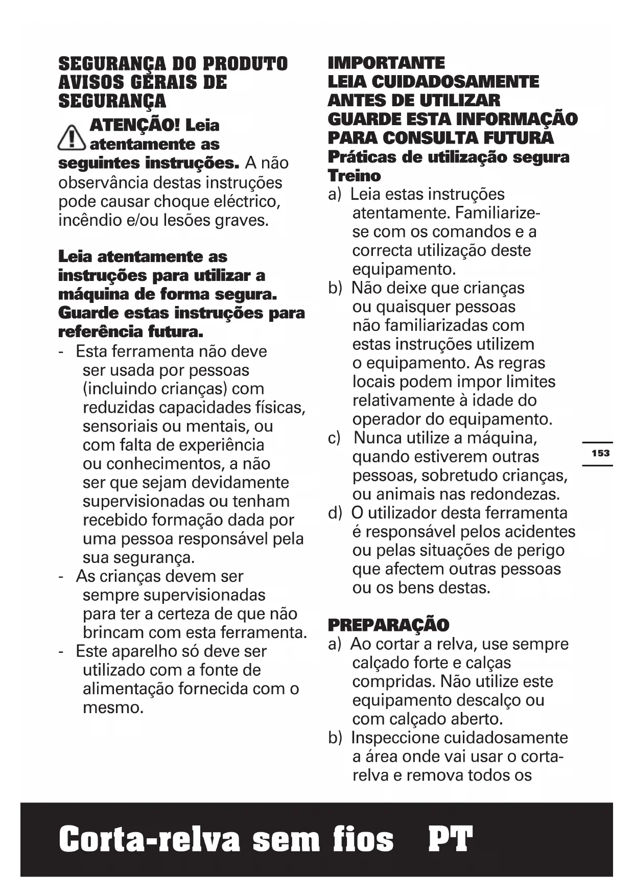 Práticas de utilização segura Treino a) Leia estas instruções atentamente. Familiarize- se com os comandos e a correcta utilização deste equipamento. b) Não deixe que crianças ou quaisquer pessoas não familiarizadas com estas instruções utilizem o equipamento. As regras locais podem impor limites relativamente à idade do operador do equipamento. c) Nunca utilize a máquina, quando estiverem outras pessoas, sobretudo crianças, ou animais nas redondezas. d) O utilizador desta ferramenta é responsável pelos acidentes ou pelas situações de perigo que afectem outras pessoas ou os bens destas. PREPARAÇÃO a) Ao cortar a relva, use sempre calçado forte e calças compridas. Não utilize este equipamento descalço ou com calçado aberto. b) Inspeccione cuidadosamente a área onde vai usar o corta- relva e remova todos os154 Corta-relva sem fios PT objectos que possam ser lançados pelo mesmo; c) Antes de usar o corta-relva, verifique sempre as lâminas, os parafusos destas e os elementos de corte para se certificar de que estes não estão gastos ou danificados. Substitua os conjuntos de lâminas e de parafusos que estejam gastos ou danificados para que o corta- relva funcione bem. FUNCIONAMENTO a) Utilize este equipamento apenas durante o dia ou com uma boa luz artificial. b) Sempre que possível, evite utilizar o corta-relva sobre relva molhada. c) Ao trabalhar em superfícies inclinadas certifique-se de que adopta uma posição estável. d) Caminhe, não corra; e) Ao usar máquinas com rodas, o corte de relva em terrenos inclinados deve ser feito ao longo da face do terreno e nunca para cima e para baixo; f) Ao trabalhar em locais inclinados, tenha muito cuidado ao mudar de direcção. g) Não proceda a um corte excessivo da relva em locais inclinados. h) Tenha muito cuidado ao virar ou ao puxar o equipamento na sua direcção.