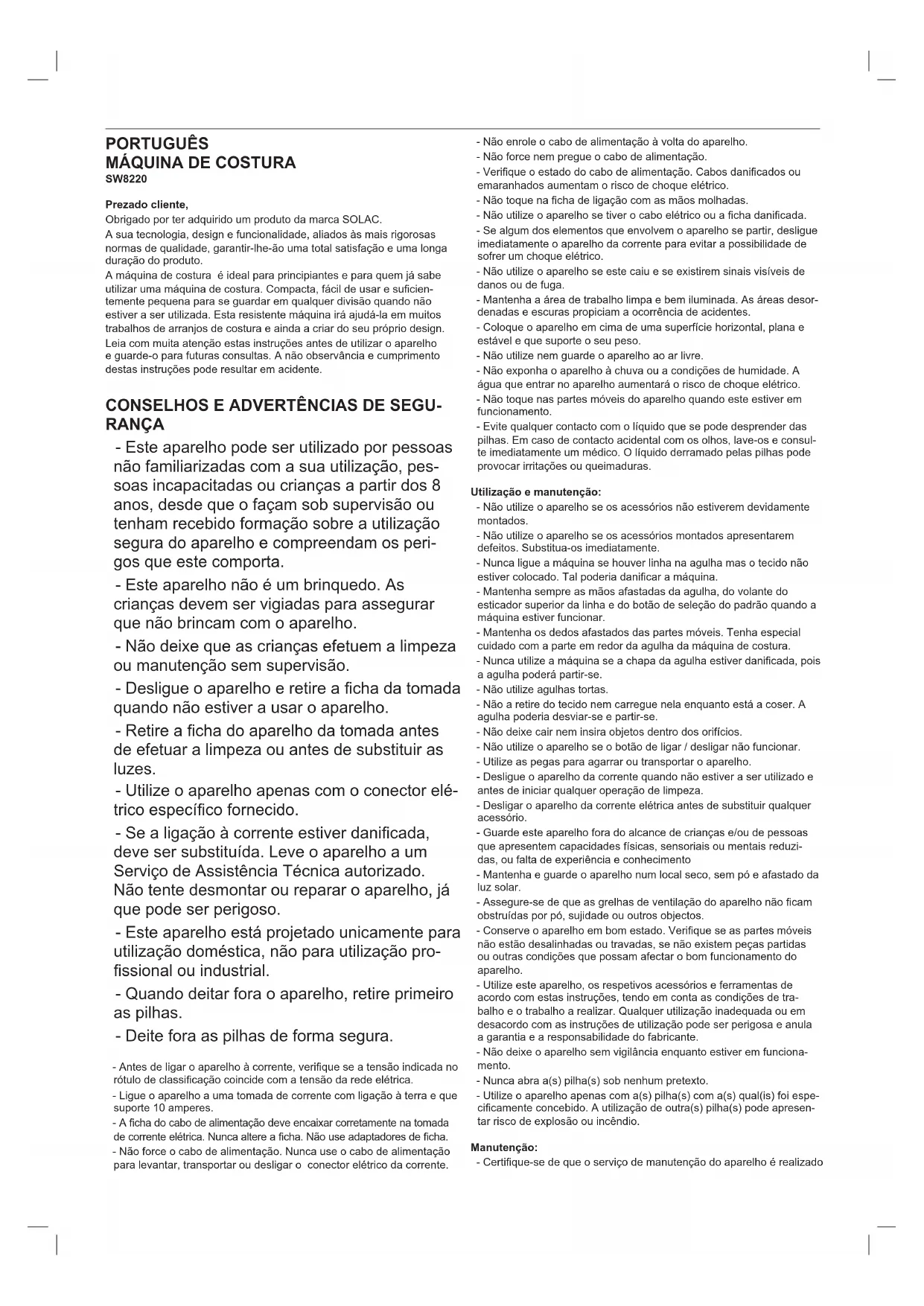 SW8220 Prezado cliente, Obrigado por ter adquirido um produto da marca SOLAC. A sua tecnologia, design e funcionalidade, aliados às mais rigorosas normas de qualidade, garantir-lhe-ão uma total satisfação e uma longa duração do produto. A máquina de costura é ideal para principiantes e para quem já sabe utilizar uma máquina de costura. Compacta, fácil de usar e sucien- temente pequena para se guardar em qualquer divisão quando não estiver a ser utilizada. Esta resistente máquina irá ajudá-la em muitos trabalhos de arranjos de costura e ainda a criar do seu próprio design. Leia com muita atenção estas instruções antes de utilizar o aparelho e guarde-o para futuras consultas. A não observância e cumprimento destas instruções pode resultar em acidente.