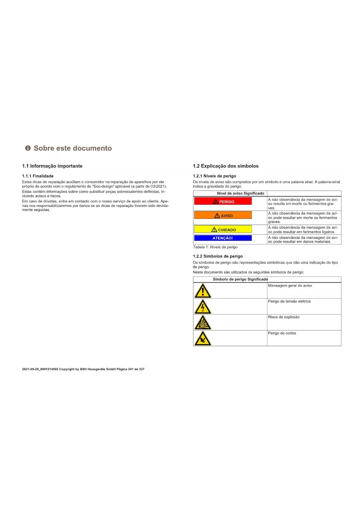 Os símbolos de perigo são representações simbólicas que dão uma indicação do tipo de perigo. Neste documento são utilizados os seguintes símbolos de perigo: Símbolo de perigo Significado Mensagem geral de aviso Perigo de tensão elétrica Risco de explosão Perigo de cortes Sobre este documento 2021-09-29_8001214502 Copyright by BSH Hausgeräte GmbH Página241de337Símbolo de perigo Significado Perigo de esmagamento Perigo de superfícies quentes Perigo de campo eletromagnético intenso Perigo de radiação não-ionizante Tabela2: Símbolos de perigo