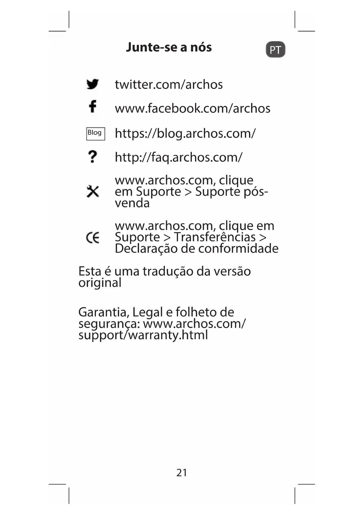 Junte-se a nós twitter.com/archos www.facebook.com/archos Blog https://blog.archos.com/ http://faq.archos.com/ www.archos.com, clique em Suporte > Suporte pós- venda www.archos.com, clique em Suporte > Transferências > Declaração de conformidade Esta é uma tradução da versão original Garantia, Legal e folheto de segurança: www.archos.com/ support/warranty.html22