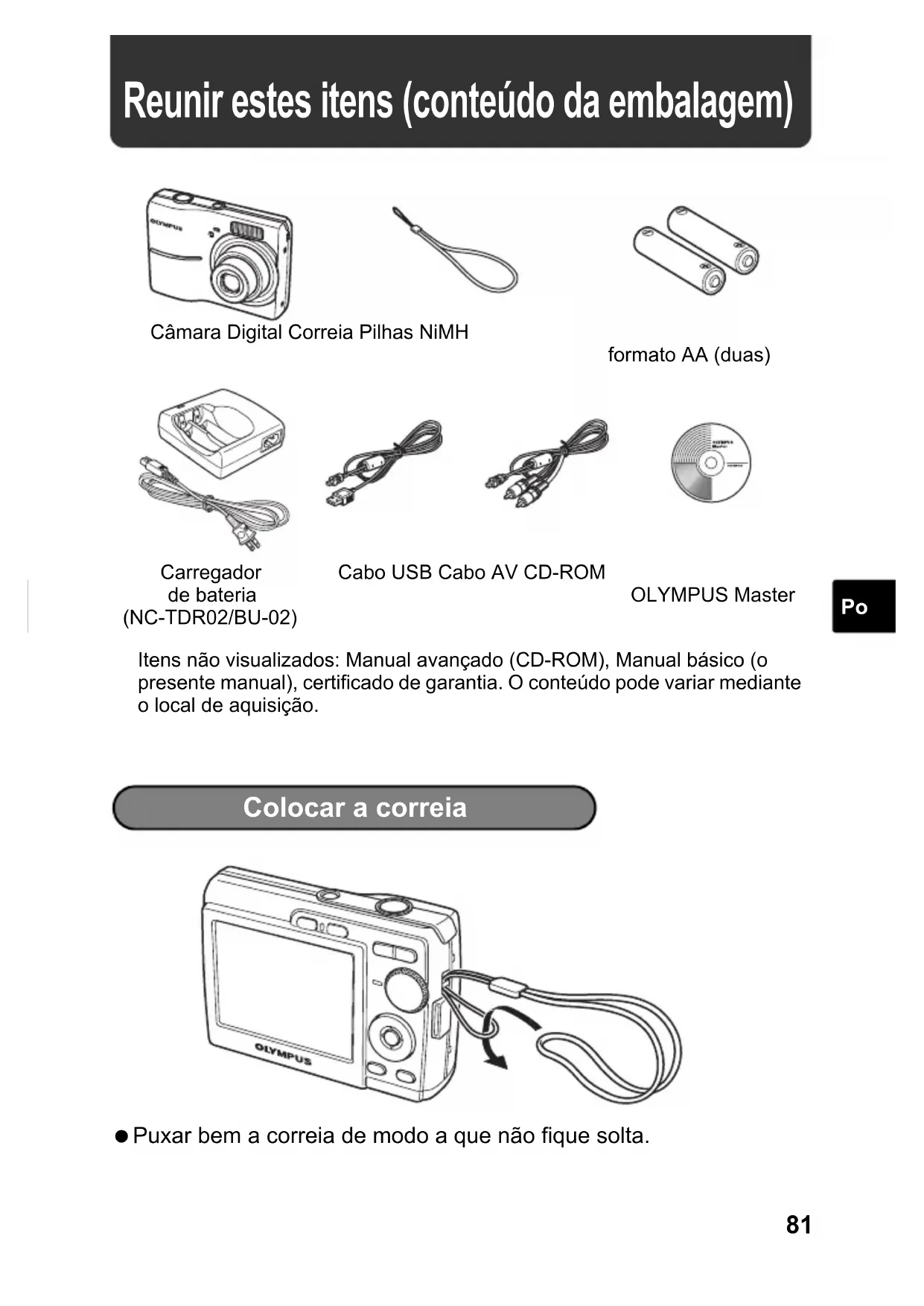Reunir estes itens (conteúdo da embalagem) Puxar bem a correia de modo a que não fique solta. Câmara Digital Correia Pilhas NiMH formato AA (duas)Carregador de bateria(NC-TDR02/BU-02)Cabo USB Cabo AV CD-ROM OLYMPUS MasterItens não visualizados: Manual avançado (CD-ROM), Manual básico (o presente manual), certificado de garantia. O conteúdo pode variar mediante o local de aquisição. Colocar a correia d4330_p_basic_00_bookfile.book Page 81 Tuesday, July 4, 2006 12:06 PM82