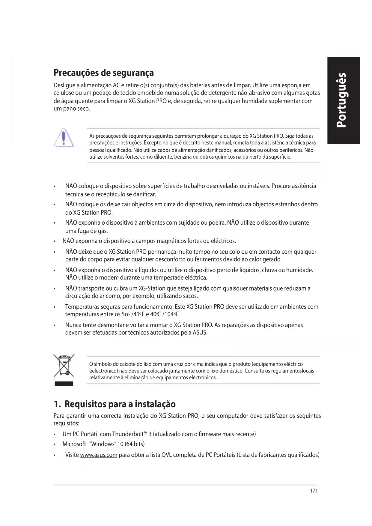 - Nunca tente desmontar e voltar a montar o XG Station PRO. As reparações as dispositivo apenas devem ser efetuadas por técnicos autorizados pela ASUS. O símbolo do caixote do lixo com uma cruz por cima indica que o produto (equipamento eléctrico eelectrónico) não deve ser colocado juntamente com o lixo doméstico. Consulte os regulamentoslocais relativamente à eliminação de equipamentos electrónicos. Português