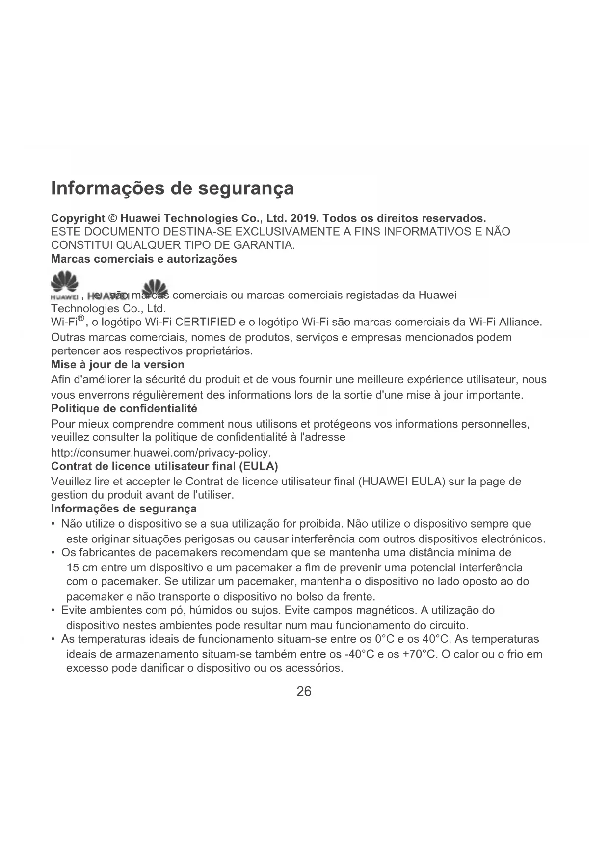 , o logótipo Wi-Fi CERTIFIED e o logótipo Wi-Fi são marcas comerciais da Wi-Fi Alliance. Outras marcas comerciais, nomes de produtos, serviços e empresas mencionados podem pertencer aos respectivos proprietários. Atualização de versão Para melhorar a segurança do produto e fornecer-lhe uma melhor experiência de utilizador, enviar-lhe-emos regularmente informações de atualização da versão quando for lançada uma atualização importante. Política de Privacidade Para compreender melhor a forma como utilizamos e protegemos as suas informações pessoais, consulte a política de privacidade em http://consumer.huawei.com/privacy-policy. Condições de Licença do Utilizador Final Leia e aceite as Condições de Licença do Utilizador Final (HUAWEI EULA) na página de gestão do produto antes de o utilizar. Informações de segurança