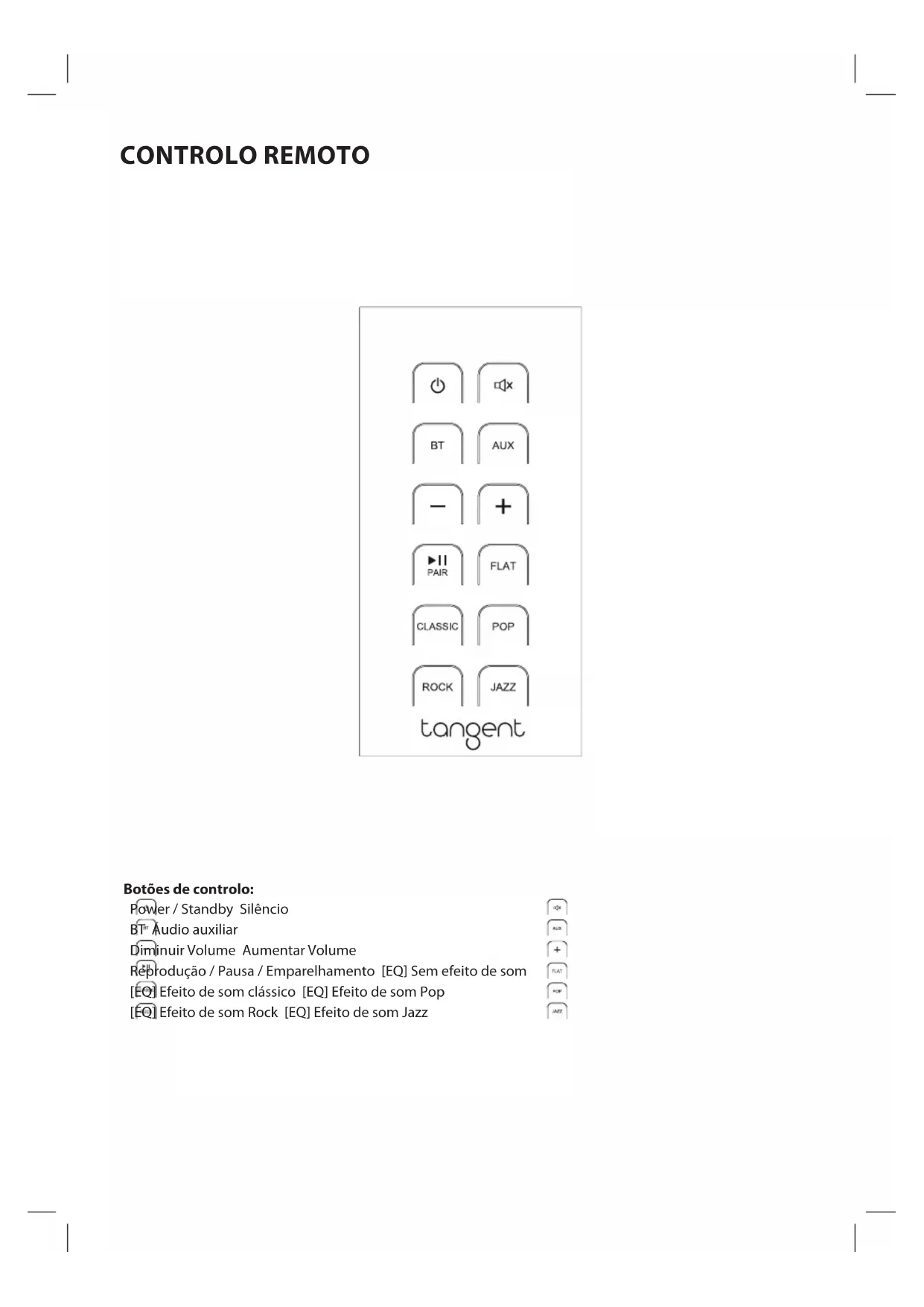 Indicador LER na grelha da coluna: Sem luz – Standby A piscar - Sinal remoto recebido Branco esfumado – Ligado Branco esfumado – Pisca quando ligado e silêncio Super branco – Aux-in Super branco – Ligação Bluetooth Super branco – Pisca com frequência para ligação Bluetooth DC in – Ligado a Adaptador de Corrente Aux in – inserido com fonte de entrada externa (por exemplo iPhone, Smartphone, Leitor de MP3 e TV ) USB para carregar – Ligue-a para carregar o seu dispositivo móvel AUX INUSB CHARGETHE OBJECTIVE OF EVERY TANGENT PRODUCT IS THAT FUNDAMENTALLY CORRECT DESIGN CAN PRODUCE A PRODUCT CAPABLE OF ACHIEVING EXCELLENT PERFOMANCE AND AFFORDABILITY. TANGENTCLASSICCAUTION: TO REDUCE THE RISKOF ELECTRIC SHOCK, DO NOTREMOVE COVER (OR BACK).NO USER-SERVICEABLE PARTS INSIDE. REFER SERVICING TO QUALIFIED SERVICE PERSONNEL.RISK OF ELECTRIC SHOCKDO NOT OPEN CAUTION Item No.:Batch No.:Serial No.:WARRANTY VOID IF UNIT OPENEDDESIGNED AND DEVELOPED IN DENMARK BY TANGENT AUDIO24V DC 2.5A PAINEL TRASEIRO PAINEL FRONTAL PTCONTROLO REMOTO Botões de controlo: Power / Standby Silêncio BT Áudio auxiliar Diminuir Volume Aumentar Volume Reprodução / Pausa / Emparelhamento [EQ] Sem efeito de som [EQ] Efeito de som clássico [EQ] Efeito de som Pop [EQ] Efeito de som Rock [EQ] Efeito de som JazzINSTALAÇÃO/SUBSTITUIÇÃO DAS BATERIAS O controlo remoto vem com uma pilha CR2025 que deve ser colocada. Quando o limite do controlo remoto parecer reduzido ou se deixar de funcionar correctamente, está na altura de substituir a pilha