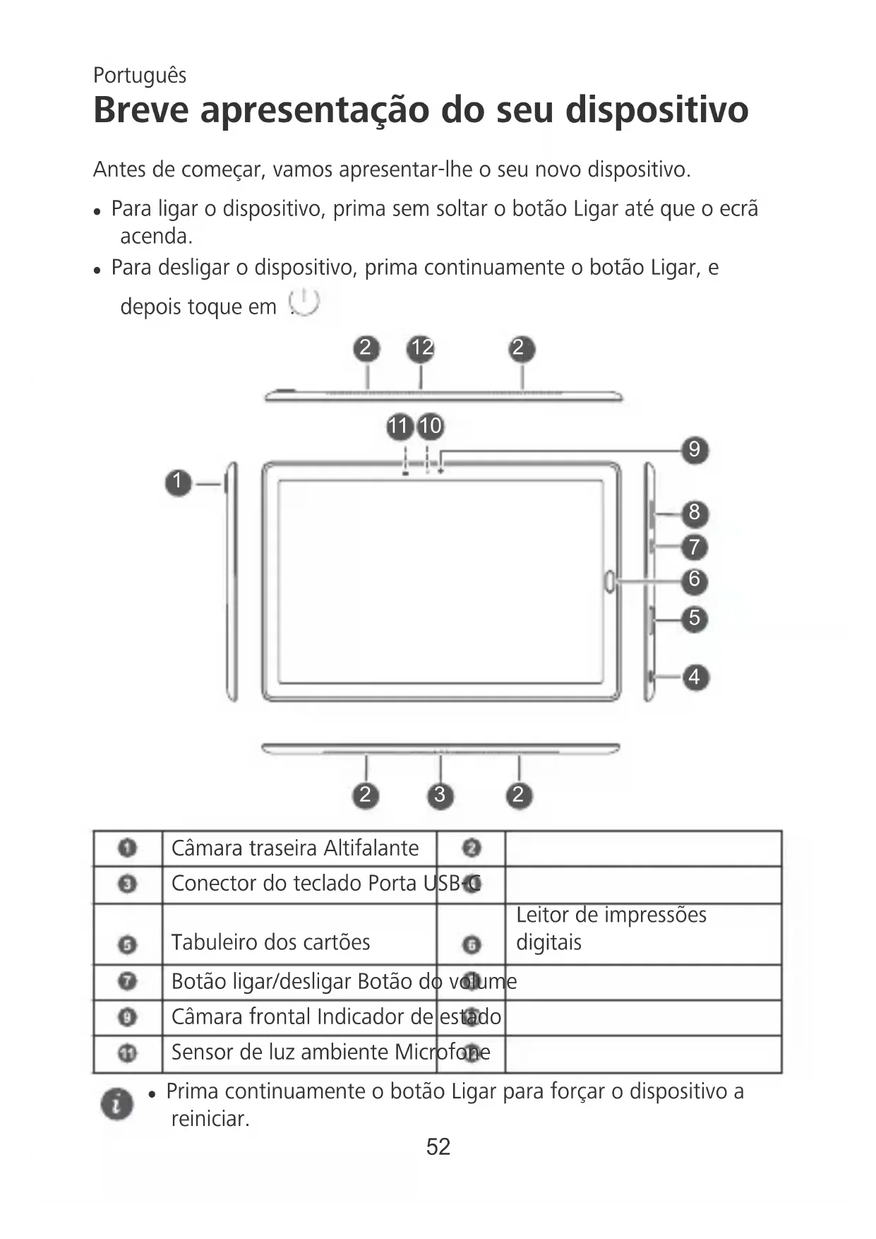 , visite el sitio web www.energystar.gov. Política de privacidad Para comprender cómo protegemos su información personal, consulte la política de privacidad en http://consumer.huawei.com/privacy-policy. Copyright © Huawei Technologies Co., Ltd. 2018. Reservados todos los derechos. ESTE DOCUMENTO ES MERAMENTE INFORMATIVO Y NO CONSTITUYE NINGÚN TIPO DE GARANTÍA. 51Breve apresentação do seu dispositivo Antes de começar, vamos apresentar-lhe o seu novo dispositivo. l Para ligar o dispositivo, prima sem soltar o botão Ligar até que o ecrã acenda. l Para desligar o dispositivo, prima continuamente o botão Ligar, e depois toque em .