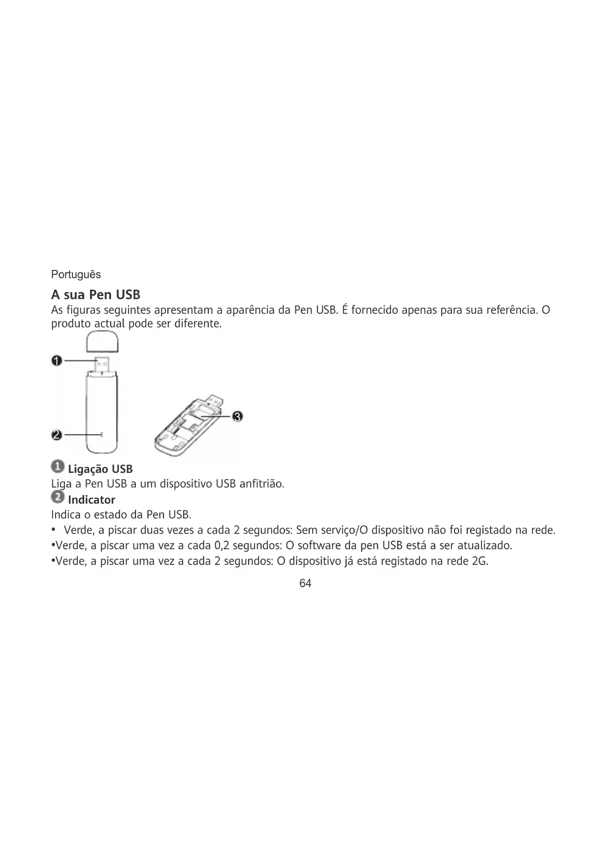 - Apagado: A pen USB não está inserida. Depois de o dispositivo ser inserido na porta USB, o indicador ca verde sólido, o que indica que o processo de arranque do software foi iniciado. Depois de o arranque terminar, o indicador funciona conforme detalhado acima. Entrada cartão SIM Detém um cartão SIM (Módulo de Identicação do Assinante). Preparar o dispositivo USB 1 Faça deslizar a tampa para removê-la da pen USB. 2 Insira o cartão SIM na entrada para cartões correspondente, conforme demonstrado na imagem seguinte. 3 Volte a colocar a tampa, fazendo-a deslizar até encaixar no devido lugar. 65• Certique-se de que a aresta biselada do cartão SIM está devidamente alinhada com a da ranhura do cartão SIM.