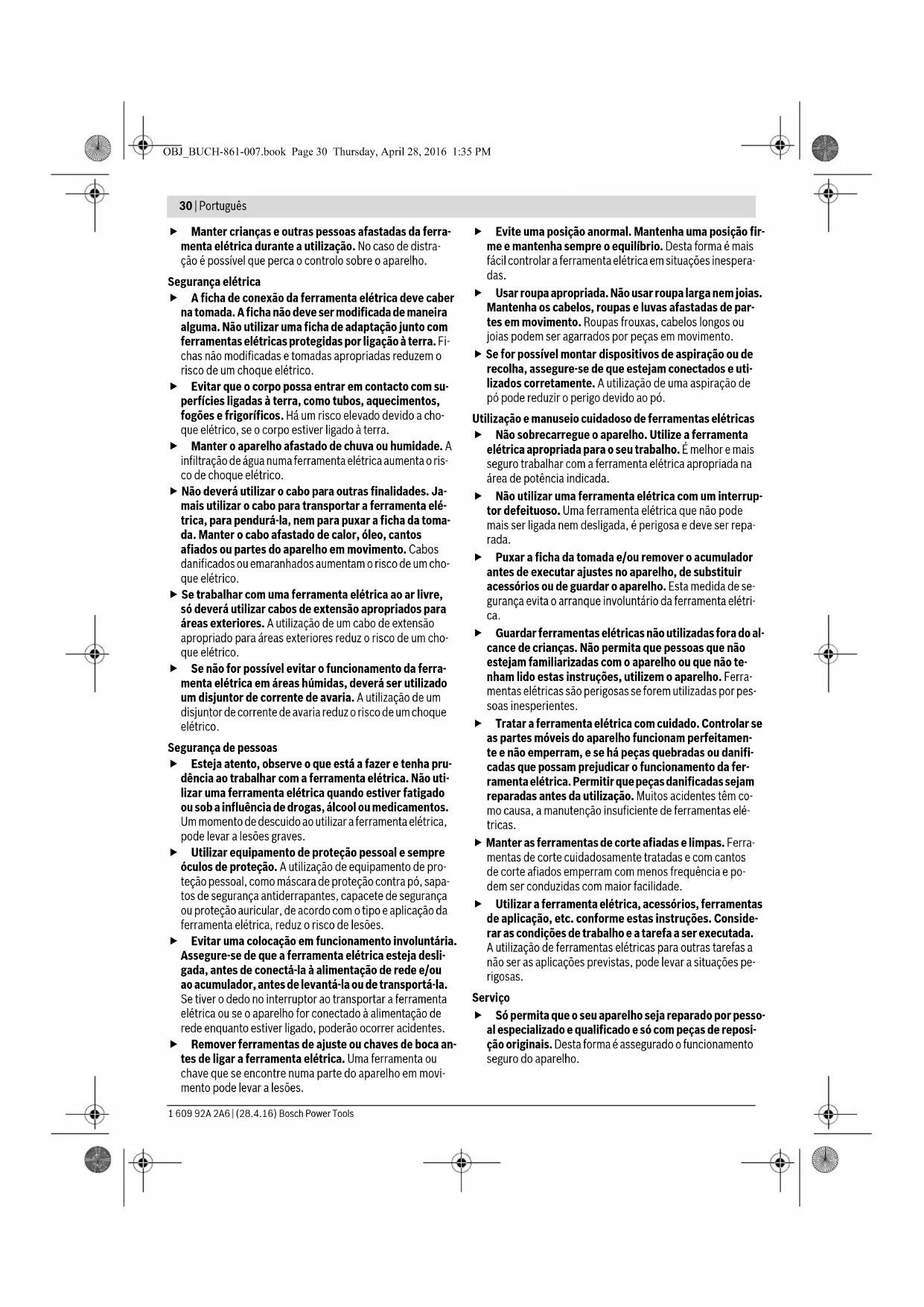 –Para desligar a ferramenta elétrica, deverá soltar o inter- ruptor de ligar-desligar 6. Com o interruptor de ligar-desli- gar 6 travado deverá pressioná-lo primeiramente e soltá-lo em seguida. Para poupar energia só deverá ligar a ferramenta elétrica quando ela for utilizada. Ajustar o n.º de rotações/de percussões O número de rotações/de percussões da ferramenta elétrica ligada pode ser regulado sem escalonamento, dependendo de quanto premir o interruptor de ligar-desligar 6. Uma leve pressão sobre o interruptor de ligar-desligar 6 pro- voca um baixo n.º de rotações/n.º de percussões. Aumentan- do a pressão, é aumentado o n.º de rotações/n.º de percus- sões. Acoplamento de sobrecarga O acionamento do veio de perfuração é interrompido se a ferramenta de trabalho emperrar ou enganchar. Sempre segurar, devido às forças produzidas, a ferra- menta elétrica firmemente com ambas as mãos e man- ter uma posição firme. Desligar a ferramenta elétrica e soltar a ferramenta de trabalho, se a ferramenta elétrica bloquear. Ao ligar o aparelho com uma broca bloqueada são produzidos al- tos momentos de reação. Indicações de trabalho Antes de todos trabalhos na ferramenta elétrica deverá puxar a ficha de rede da tomada. Alterar a posição do cinzel (Vario-Lock) O cinzel pode ser travado em 36 posições. Desta forma é pos- sível colocá-lo na posição otimizada para o respetivo traba- lho. – Introduzir o cinzel no encabadouro. – Girar o interruptor de percussão/paragem de rotação 9 pa- ra a posição “Vario-Lock” (veja “Ajustar o tipo de funciona- mento”, página 34). – Girar o encabadouro para a posição do cinzel desejada. – Girar o interruptor de percussão/paragem de rotação 9 pa- ra a posição “cinzelar”. Desta forma a fixação da ferramen- ta é travada. – Para cinzelar, o sentido de rotação deve ser colocado na marcha à direita. Introduzir bits de aparafusamento (veja figura H) Utilizar os punhos adicionais fornecidos com a ferra- menta elétrica. A perda de controlo sobre a ferramenta elétrica pode levar a lesões. Para os bits de aparafusamento é necessário um porta-bits universal 22 com admissão SDS-plus (acessório). – Limpar a extremidade de encaixe do encabadouro e lubri- ficá-la levemente. – Introduzir a ferramenta de trabalho no porta-bits univer- sal, girando até travar-se automaticamente. – Puxar pelo porta-bits universal para controlar o travamen- to. – Introduzir um bit de aparafusamento no porta-bits univer- sal. Só utilizar bits de aparafusamento apropriados para o cabeçote de aparafusamento. – Para retirar o porta-bits universal e empurrar a bucha de travamento 3 para trás e retirar o porta-bits universal 22 da admissão de ferramentas. Posição para furar com percussão em be- tão ou pedra Posição para furar sem percussão, em ma- deira, metal, cerâmica e plástico, assim co- mo para aparafusar Posição Vario-Lock para mudar a posição de cinzelar O interruptor de percussão/paragem de ro- tação 9 não engata nesta posição. Posição para cinzelar OBJ_BUCH-861-007.book Page 34 Thursday, April 28, 2016 1:35 PMItaliano | 35 Bosch Power Tools 1 609 92A 2A6 | (28.4.16) Manutenção e serviço Manutenção e limpeza Antes de todos trabalhos na ferramenta elétrica deverá puxar a ficha de rede da tomada. Manter a ferramenta elétrica e as aberturas de ventila- ção sempre limpas, para trabalhar bem e de forma se- gura. Se for necessário substituir o cabo de conexão, isto deverá ser realizado pela Bosch ou por uma oficina de serviço pós- venda autorizada para todas as ferramentas elétricas Bosch para evitar riscos de segurança. Uma capa de proteção contra pó deve ser substituída imediatamente. Recomendamos que esta tarefa seja efetuada por uma oficina de serviço pós-venda. – Limpar a admissão de ferramentas 1 após cada utilização. Serviço pós-venda e consultoria de aplicação O serviço pós-venda responde às suas perguntas a respeito de serviços de reparação e de manutenção do seu produto, assim como das peças sobressalentes. Desenhos explodidos e informações sobre peças sobressalentes encontram-se em: www.bosch-pt.com A nossa equipa de consultoria de aplicação Bosch esclarece com prazer todas as suas dúvidas a respeito da compra, apli- cação e ajuste dos produtos e acessórios. Indique para todas as questões e encomendas de peças so- bressalentes a referência de 10 dígitos de acordo com a placa de caraterísticas do produto. Portugal Robert Bosch LDA Avenida Infante D. Henrique Lotes 2E – 3E 1800 Lisboa Para efetuar o seu pedido online de peças entre na página www.ferramentasbosch.com. Tel.: 21 8500000 Fax: 21 8511096 Brasil Robert Bosch Ltda. Caixa postal 1195 13065-900 Campinas Tel.: (0800) 7045446 www.bosch.com.br/contacto Eliminação Ferramentas elétricas, acessórios e embalagens devem ser enviados a uma reciclagem ecológica de matérias-primas. Não deitar ferramentas elétricas no lixo doméstico! Apenas países da União Europeia: De acordo com a diretiva europeia 2012/19/UE para aparelhos elétricos e ele- trónicos velhos, e com as respetivas realiza- ções nas leis nacionais, as ferramentas elé- tricas que não servem mais para a utilização, devem ser enviadas separadamente a uma reciclagem ecológica. Sob reserva de alterações. Italiano Norme di sicurezza Avvertenze generali di pericolo per elettroutensi-