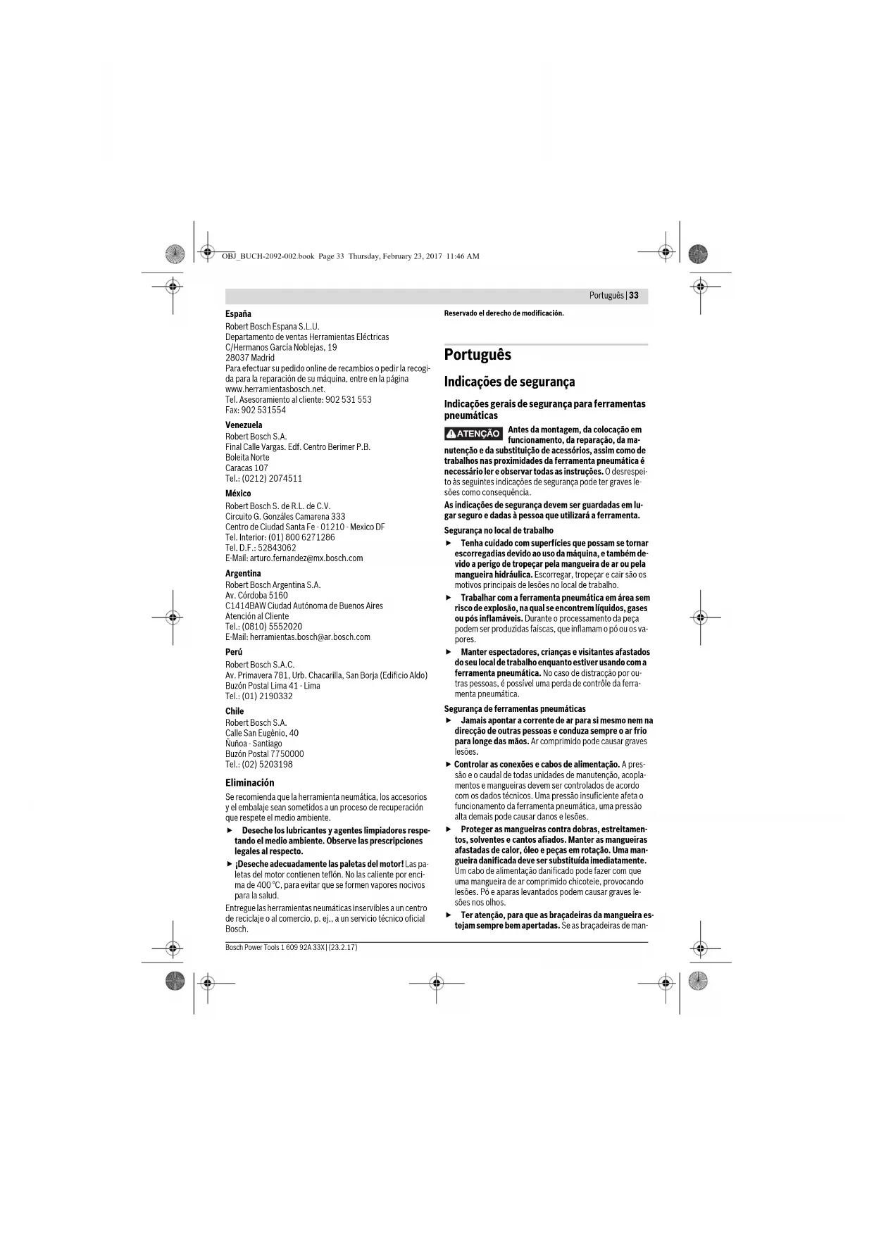 OBJ_BUCH-2092-002.book Page 32 Thursday, February 23, 2017 11:46 AMPortuguês | 33 Bosch Power Tools 1 609 92A 33X | (23.2.17) España Robert Bosch Espana S.L.U. Departamento de ventas Herramientas Eléctricas C/Hermanos García Noblejas, 19 28037 Madrid Para efectuar su pedido online de recambios o pedir la recogi- da para la reparación de su máquina, entre en la página www.herramientasbosch.net. Tel. Asesoramiento al cliente: 902 531 553 Fax: 902 531554 Venezuela Robert Bosch S.A. Final Calle Vargas. Edf. Centro Berimer P.B. Boleita Norte Caracas 107 Tel.: (0212) 2074511 México Robert Bosch S. de R.L. de C.V. Circuito G. Gonzáles Camarena 333 Centro de Ciudad Santa Fe - 01210 - Mexico DF Tel. Interior: (01) 800 6271286 Tel. D.F.: 52843062 E-Mail: arturo.fernandez@mx.bosch.com Argentina Robert Bosch Argentina S.A. Av. Córdoba 5160 C1414BAW Ciudad Autónoma de Buenos Aires Atención al Cliente Tel.: (0810) 5552020 E-Mail: herramientas.bosch@ar.bosch.com Perú Robert Bosch S.A.C. Av. Primavera 781, Urb. Chacarilla, San Borja (Edificio Aldo) Buzón Postal Lima 41 - Lima Tel.: (01) 2190332 Chile Robert Bosch S.A. Calle San Eugênio, 40 Ñuñoa - Santiago Buzón Postal 7750000 Tel.: (02) 5203198 Eliminación Se recomienda que la herramienta neumática, los accesorios y el embalaje sean sometidos a un proceso de recuperación que respete el medio ambiente. Deseche los lubricantes y agentes limpiadores respe- tando el medio ambiente. Observe las prescripciones legales al respecto. ¡Deseche adecuadamente las paletas del motor! Las pa- letas del motor contienen teflón. No las caliente por enci- ma de 400 °C, para evitar que se formen vapores nocivos para la salud. Entregue las herramientas neumáticas inservibles a un centro de reciclaje o al comercio, p. ej., a un servicio técnico oficial Bosch. Reservado el derecho de modificación. Português Indicações de segurança Indicações gerais de segurança para ferramentas pneumáticas Antes da montagem, da colocação em funcionamento, da reparação, da ma- nutenção e da substituição de acessórios, assim como de trabalhos nas proximidades da ferramenta pneumática é necessário ler e observar todas as instruções. O desrespei- to às seguintes indicações de segurança pode ter graves le- sões como consequência. As indicações de segurança devem ser guardadas em lu- gar seguro e dadas à pessoa que utilizará a ferramenta. Segurança no local de trabalho Tenha cuidado com superfícies que possam se tornar escorregadias devido ao uso da máquina, e também de- vido a perigo de tropeçar pela mangueira de ar ou pela mangueira hidráulica. Escorregar, tropeçar e cair são os motivos principais de lesões no local de trabalho. Trabalhar com a ferramenta pneumática em área sem risco de explosão, na qual se encontrem líquidos, gases ou pós inflamáveis. Durante o processamento da peça podem ser produzidas faíscas, que inflamam o pó ou os va- pores. Manter espectadores, crianças e visitantes afastados do seu local de trabalho enquanto estiver usando com a ferramenta pneumática. No caso de distracção por ou- tras pessoas, é possível uma perda de contrôle da ferra- menta pneumática. Segurança de ferramentas pneumáticas Jamais apontar a corrente de ar para si mesmo nem na direcção de outras pessoas e conduza sempre o ar frio para longe das mãos. Ar comprimido pode causar graves lesões. Controlar as conexões e cabos de alimentação. A pres- são e o caudal de todas unidades de manutenção, acopla- mentos e mangueiras devem ser controlados de acordo com os dados técnicos. Uma pressão insuficiente afeta o funcionamento da ferramenta pneumática, uma pressão alta demais pode causar danos e lesões. Proteger as mangueiras contra dobras, estreitamen- tos, solventes e cantos afiados. Manter as mangueiras afastadas de calor, óleo e peças em rotação. Uma man- gueira danificada deve ser substituída imediatamente. Um cabo de alimentação danificado pode fazer com que uma mangueira de ar comprimido chicoteie, provocando lesões. Pó e aparas levantados podem causar graves le- sões nos olhos. Ter atenção, para que as braçadeiras da mangueira es- tejam sempre bem apertadas. Se as braçadeiras de man- ATENÇÃO OBJ_BUCH-2092-002.book Page 33 Thursday, February 23, 2017 11:46 AM34 | Português 1 609 92A 33X | (23.2.17) Bosch Power Tools gueiras estiverem frouxas ou danificadas, o ar poderá es- capar descontroladamente. Segurança de pessoas Esteja atento, observe o que está a fazer e tenha pru- dência ao trabalhar com uma ferramenta pneumática. Não utilizar uma ferramenta pneumática quando esti- ver fatigado ou sob a influência de drogas, álcool ou medicamentos. Um momento de descuido ao utilizar a ferramenta pneumática, pode levar a lesões graves. Utilizar equipamento de protecção pessoal e sempre óculos de protecção. O uso de equipamento de protecção individual, como respiradores, sapatos anti-derrapantes de segurança, capacetes ou protecção auditiva exigidos nas instruções do seu empregador ou como exigido pelas directivas de protecção de trabalho e de saúde, reduz o ris- co de lesões. Evitar uma colocação em funcionamento involuntária. Assegure-se de que a ferramenta pneumática esteja desligada, antes de ser ligada à alimentação de ar, an- tes de ser apanhada ou de ser transportada. Se tiver o dedo no interruptor de ligar-desligar ao transportar a ferra- menta pneumática ou se a ferramenta pneumática for co- nectada à alimentação de ar enquanto estiver ligada, po- derão ocorrer acidentes. Remover as ferramentas de ajuste antes de ligar a fer- ramenta pneumática. Uma ferramenta de ajuste que se encontre numa peça da ferramenta pneumática em rota- ção, pode levar a lesões. Não se sobrestime. Mantenha uma posição firme e mantenha sempre o equilíbrio. Uma posição firme e uma postura adequada permitem que a ferramenta pneumática possa ser controlada com maior 