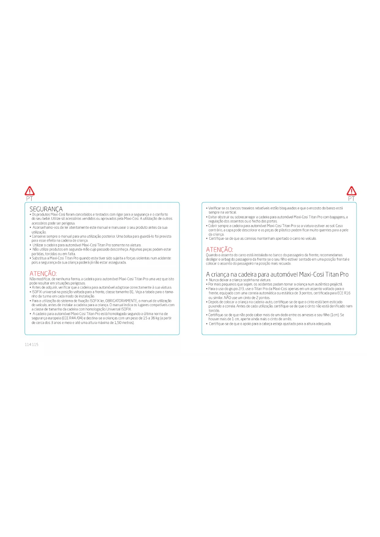 - Substitua a Maxi-Cosi Titan Pro quando esta tiver sido sujeita a forças violentas num acidente: pois a segurança da sua criança poderá já não estar assegurada. ATENÇÃO: Não modicar, de nenhuma forma, a cadeira para automóvel Maxi-Cosi Titan Pro uma vez que isto pode resultar em situações perigosas.