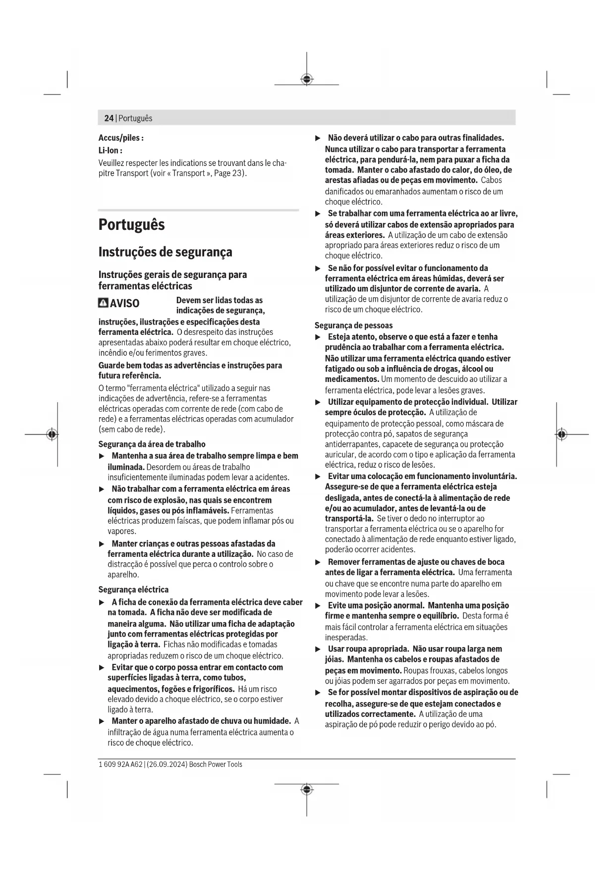 ferencia. Incluyendo la que pueda causar su operación no deseada. Bosch Power Tools 1 609 92A A62 | (26.09.2024)42 | Português do Brasil El símbolo es solamente válido, si también se encuentra sobre la placa de características del producto/fabricado. Português do Brasil Indicações de segurança Instruções gerais de segurança para ferramentas elétricas AVISO Leia todas as indicações de segurança, instruções, ilustrações e especificações fornecidas com esta ferramenta elétrica. O desrespeito das instruções apresentadas abaixo poderá resultar em choque elétrico, incêndio e/ou ferimentos graves. Guarde todas as advertências e instruções para futura referência. O termo "ferramenta elétrica" em todos os avisos listados abaixo referem‑se a ferramenta alimentada através de seu cordão de alimentação ou a ferramenta operada a bateria (sem cordão). Segurança da área de trabalho u Mantenha a área de trabalho limpa e bem iluminada. As áreas de trabalho desarrumadas ou escuras podem levar a acidentes. u Não opere as ferramentas elétricas em atmosferas explosivas, ou seja, na presença de líquidos, gases ou pós inflamáveis. As ferramentas criam faíscas que podem inflamar a poeira ou os vapores. u Mantenha as crianças e outras pessoas afastadas da ferramenta elétrica durante o uso. As distrações podem resultar na perda do controle. Segurança elétrica u Os plugues da ferramenta devem ser compatíveis com as tomadas. Nunca modifique o plugue. Não use plugues de adaptador com ferramentas aterradas. Os plugues sem modificações aliados a utilização de tomadas compatíveis reduzem o risco de choque elétrico. u Evite o contato do corpo com superfícies aterradas, como tubos, aquecedores, fogões e geladeiras. Há um risco elevado de choque elétrico se seu corpo estiver aterrado. u Mantenha as ferramentas elétricas afastadas da chuva ou umidade. A entrada de água em uma ferramenta elétrica aumenta o risco de choque elétrico. u Não use o cabo para outras finalidades. Jamais use o cabo para transportar, puxar ou desconectar a ferramenta elétrica. Mantenha o cabo afastado do calor, do óleo, de arestas afiadas ou de partes móveis. Os cabos danificados ou emaranhados aumentam o risco de um choque elétrico. u Ao operar uma ferramenta elétrica ao ar livre, use um cabo de extensão adequado para áreas exteriores. O uso de um cabo de extensão apropriado para áreas exteriores reduz o risco de choque elétrico. u Se não for possível evitar o funcionamento da ferramenta elétrica em áreas úmidas, utilizar uma alimentação protegida por um dispositivo de corrente diferencial residual (DR). O uso de um DR reduz o risco de um choque elétrico. Segurança pessoal u Fique atento, olhe o que está fazendo e use o bom senso ao operar uma ferramenta. Não use uma ferramenta elétrica quando estiver cansado ou sob a influência de drogas, álcool ou medicamentos. Um momento de desatenção enquanto opera uma ferramenta pode resultar em graves ferimento pessoal. u Use equipamento de proteção individual. Use sempre óculos de proteção. O uso de equipamento de proteção individual, como máscara de proteção contra poeira, sapatos de segurança antiderrapantes, capacete de segurança ou proteção auricular, usado nas condições adequadas irá reduzir o risco de ferimentos pessoais. u Evite a partida não intencional. Assegure‑se de que o interruptor está na posição de desligado antes de conectar o plugue na tomada e/ou bateria, pegar ou carregar a ferramenta. Carregar as ferramentas com o seu dedo no interruptor ou conectar as ferramentas que apresentam interruptor na posição "ligado", são convites a acidentes. u Remova qualquer ferramenta ou chave de ajuste antes de ligar a ferramenta elétrica. Uma ferramenta ou chave ainda ligada a uma parte rotativa da ferramenta elétrica pode resultar em ferimentos pessoais. u Evite uma posição anormal. Mantenha uma posição firme e mantenha sempre o equilíbrio. Desta forma é mais fácil controlar a ferramenta elétrica em situações inesperadas. u Use vestuário apropriado. Não use roupa larga nem joias. Mantenha seus cabelos e roupas afastados de partes móveis. As roupas largas, joias ou cabelos longos podem ser agarrados por partes móveis. u Se for possível montar dispositivos de aspiração ou de coleta, assegure‑se de que são conectados e usados corretamente. O uso de um dispositivo de coleta de poeira pode reduzir os riscos associados a poeiras. u Não deixe que a familiaridade resultante do uso frequente de ferramentas permita que você se torne complacente e ignore os princípios de segurança da ferramenta. Uma ação descuidada pode causar ferimentos graves numa fração de segundo. Uso e manuseio cuidadoso da ferramenta elétrica u Não sobrecarregue a ferramenta elétrica. Use a ferramenta elétrica correta para a sua aplicação. É 1 609 92A A62 | (26.09.2024) Bosch Power ToolsPortuguês do Brasil | 43 melhor e mais seguro trabalhar com a ferramenta elétrica apropriada na área de potência para a qual foi projetada. u Não use a ferramenta elétrica se o interruptor estiver defeituoso. Qualquer ferramenta elétrica que não pode mais ser controlada com o interruptor é perigosa e deve ser reparada. u Desconecte o plugue da alimentação e/ou remova a bateria, se removível, da ferramenta elétrica antes de efetuar ajustes, trocar acessórios ou guardar as ferramentas elétricas. Tais medidas de segurança preventivas reduzem o risco de se ligar a ferramenta acidentalmente. u Guarde as ferramentas elétricas não utilizadas fora do alcance das crianças e não permita que as pessoas que não estejam familiarizadas com a ferramenta elétrica ou com essas instruções usem a ferramenta elétrica. As ferramentas elétricas são perigosas nas mãos de usuários não treinados. u Trate as ferramentas elétricas e acessórios com cuidado. Cheque o desalinhamento ou coesão das p
