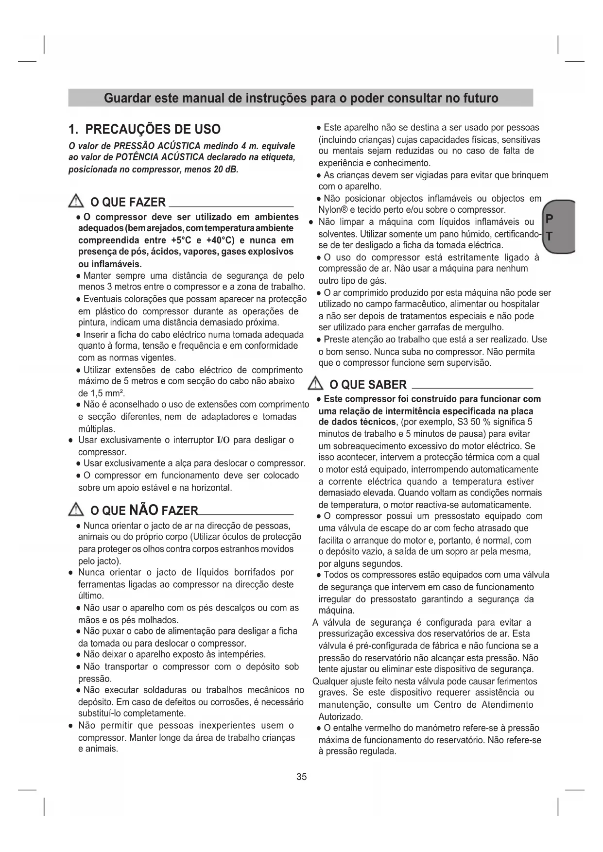 ● Este compressor foi construído para funcionar com uma relação de intermitência especicada na placa de dados técnicos, (por exemplo, S3 50 % signica 5 minutos de trabalho e 5 minutos de pausa) para evitar um sobreaquecimento excessivo do motor eléctrico. Se isso acontecer, intervem a protecção térmica com a qual o motor está equipado, interrompendo automaticamente a corrente eléctrica quando a temperatura estiver demasiado elevada. Quando voltam as condições normais de temperatura, o motor reactiva-se automaticamente. ● O compressor possui um pressostato equipado com uma válvula de escape do ar com fecho atrasado que facilita o arranque do motor e, portanto, é normal, com o depósito vazio, a saída de um sopro ar pela mesma, por alguns segundos. ● Todos os compressores estão equipados com uma válvula de segurança que intervem em caso de funcionamento irregular do pressostato garantindo a segurança da máquina. A válvula de segurança é congurada para evitar a pressurização excessiva dos reservatórios de ar. Esta válvula é pré-congurada de fábrica e não funciona se a pressão do reservatório não alcançar esta pressão. Não tente ajustar ou eliminar este dispositivo de segurança. Qualquer ajuste feito nesta válvula pode causar ferimentos graves. Se este dispositivo requerer assistência ou manutenção, consulte um Centro de Atendimento Autorizado. ● O entalhe vermelho do manómetro refere-se à pressão máxima de funcionamento do reservatório. Não refere-se à pressão regulada. Guardar este manual de instruções para o poder consultar no futuroP
