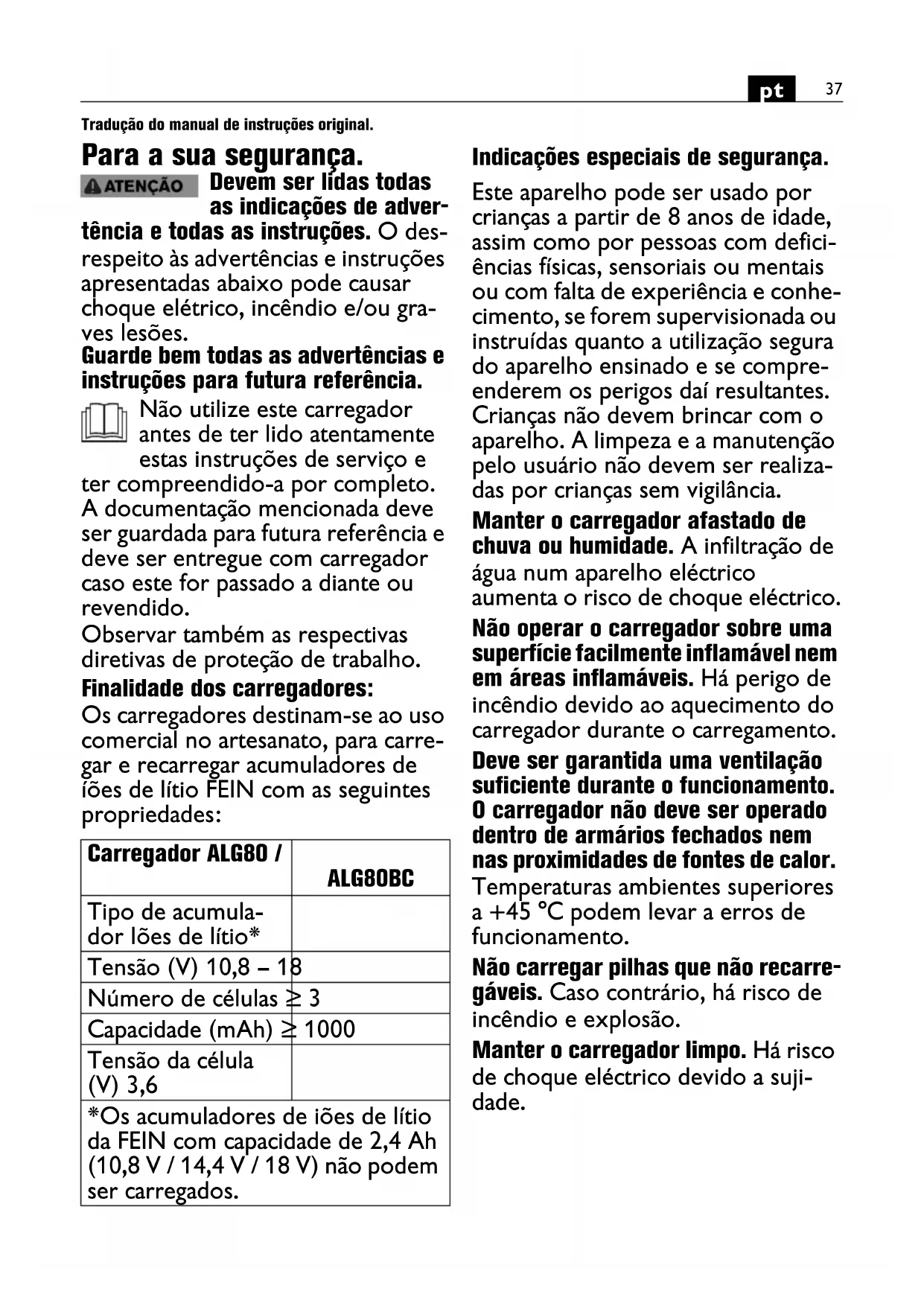Tradução do manual de instruções original. Para a sua segurança. Devem ser lidas todas as indicações de adver- tência e todas as instruções. O des- respeito às advertências e instruções apresentadas abaixo pode causar choque elétrico, incêndio e/ou gra- ves lesões. Guarde bem todas as advertências e instruções para futura referência. Não utilize este carregador antes de ter lido atentamente estas instruções de serviço e ter compreendido-a por completo. A documentação mencionada deve ser guardada para futura referência e deve ser entregue com carregador caso este for passado a diante ou revendido. Observar também as respectivas diretivas de proteção de trabalho. Finalidade dos carregadores: Os carregadores destinam-se ao uso comercial no artesanato, para carre- gar e recarregar acumuladores de íões de lítio FEIN com as seguintes propriedades: Indicações especiais de segurança. Este aparelho pode ser usado por crianças a partir de 8 anos de idade, assim como por pessoas com defici- ências físicas, sensoriais ou mentais ou com falta de experiência e conhe- cimento, se forem supervisionada ou instruídas quanto a utilização segura do aparelho ensinado e se compre- enderem os perigos daí resultantes. Crianças não devem brincar com o aparelho. A limpeza e a manutenção pelo usuário não devem ser realiza- das por crianças sem vigilância. Manter o carregador afastado de chuva ou humidade. A infiltração de água num aparelho eléctrico aumenta o risco de choque eléctrico. Não operar o carregador sobre uma superfície facilmente inflamável nem em áreas inflamáveis. Há perigo de incêndio devido ao aquecimento do carregador durante o carregamento. Deve ser garantida uma ventilação suficiente durante o funcionamento. O carregador não deve ser operado dentro de armários fechados nem nas proximidades de fontes de calor. Temperaturas ambientes superiores a +45 °C podem levar a erros de funcionamento. Não carregar pilhas que não recarre- gáveis. Caso contrário, há risco de incêndio e explosão. Manter o carregador limpo. Há risco de choque eléctrico devido a suji- dade. Carregador ALG80 / ALG80BC Tipo de acumula- dor Iões de lítio* Tensão (V) 10,8 – 18 Número de células ≥ 3 Capacidade (mAh) ≥ 1000 Tensão da célula (V) 3,6 *Os acumuladores de iões de lítio da FEIN com capacidade de 2,4 Ah (10,8 V / 14,4 V / 18 V) não podem ser carregados.38