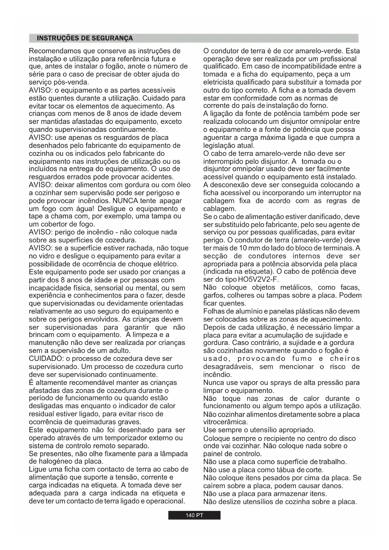 Οαισθητήραςθερμοκρασίαςαφής ενδέχεταιναέχειυποστείβλάβη. 139 GRRecomendamos que conserve as instruções de instalação e utilização para referência futura e que, antes de instalar o fogão, anote o número de série para o caso de precisar de obter ajuda do serviço pós-venda. CUIDADO: o processo de cozedura deve ser supervisionado. Um processo de cozedura curto deve ser supervisionado continuamente. AVISO: o equipamento e as partes acessíveis estão quentes durante a utilização. Cuidado para evitar tocar os elementos de aquecimento. As crianças com menos de 8 anos de idade devem ser mantidas afastadas do equipamento, exceto quando supervisionadas continuamente. AVISO: use apenas os resguardos de placa desenhados pelo fabricante do equipamento de cozinha ou os indicados pelo fabricante do equipamento nas instruções de utilização ou os incluídos na entrega do equipamento. O uso de resguardos errados pode provocar acidentes. AVISO: perigo de incêndio - não coloque nada sobre as superfícies de cozedura. É altamente recomendável manter as crianças afastadas das zonas de cozedura durante o período de funcionamento ou quando estão desligadas mas enquanto o indicador de calor residual estiver ligado, para evitar risco de ocorrência de queimaduras graves. Se presentes, não olhe fixamente para a lâmpada de halogéneo da placa. AVISO: deixar alimentos com gordura ou com óleo a cozinhar sem supervisão pode ser perigoso e pode provocar incêndios. NUNCA tente apagar um fogo com água! Desligue o equipamento e tape a chama com, por exemplo, uma tampa ou um cobertor de fogo. AVISO: se a superfície estiver rachada, não toque no vidro e desligue o equipamento para evitar a possibilidade de ocorrência de choque elétrico. Este equipamento pode ser usado por crianças a partir dos 8 anos de idade e por pessoas com incapacidade física, sensorial ou mental, ou sem experiência e conhecimentos para o fazer, desde que supervisionadas ou devidamente orientadas relativamente ao uso seguro do equipamento e sobre os perigos envolvidos. As crianças devem ser supervisionadas para garantir que não brincam com o equipamento. A limpeza e a manutenção não deve ser realizada por crianças sem a supervisão de um adulto. Ligue uma ficha com contacto de terra ao cabo de alimentação que suporte a tensão, corrente e carga indicadas na etiqueta. A tomada deve ser adequada para a carga indicada na etiqueta e deve ter um contacto de terra ligado e operacional. Este equipamento não foi desenhado para ser operado através de um temporizador externo ou sistema de controlo remoto separado.